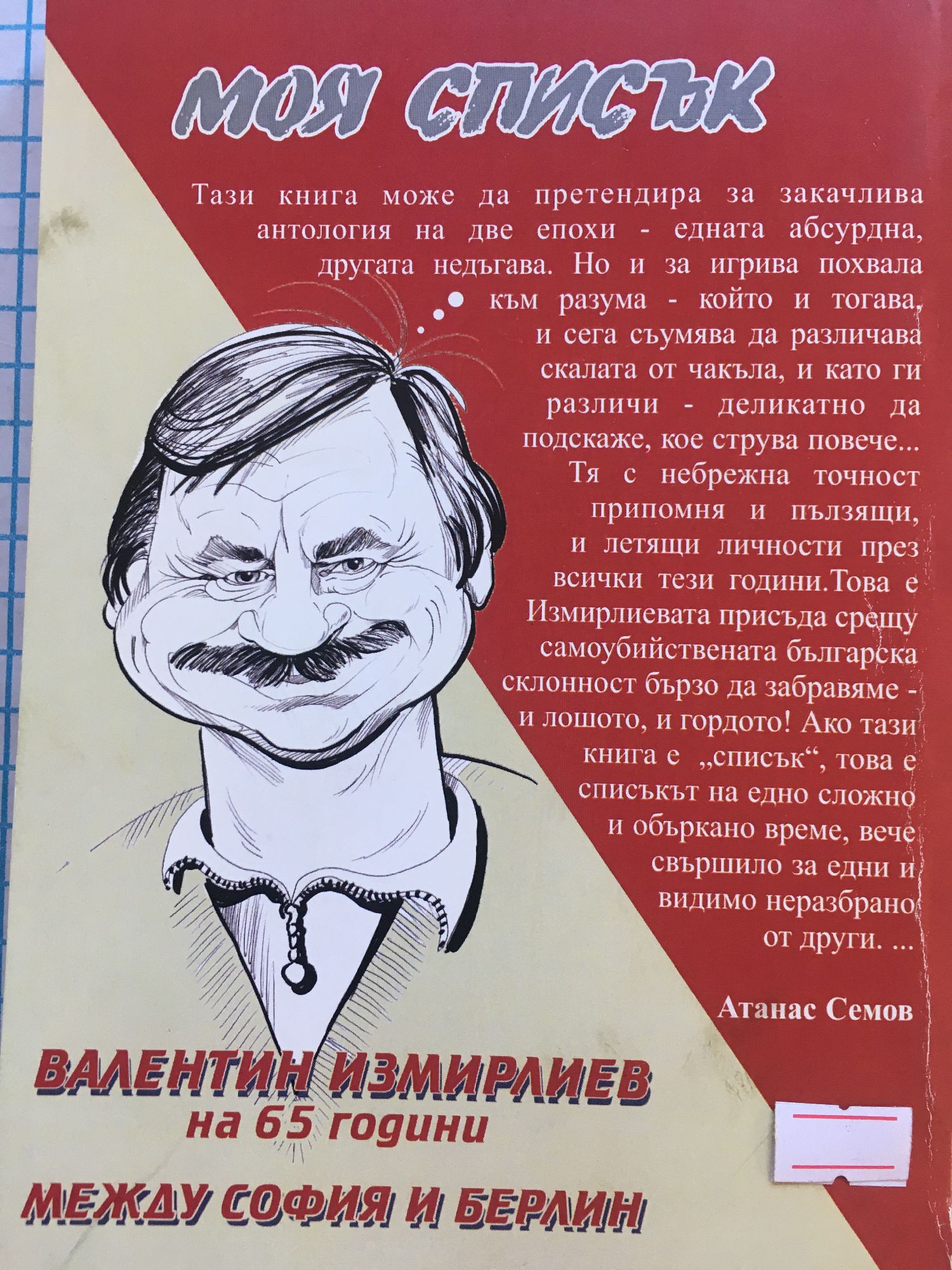 Тази книга може да претендира за закачлива антология на две епохи - едната абсурдна, другата недъгава. Но и за игрива похвала към разума - който и тогава, и сега съумява да различава скалата на чакъла, и като ги различи - деликатно да подскаже кое струва повече... Тя с небрежна точност припомня и пълзящи, и летящ личности през всичките тези години. Това е Измирлиевата присъда срещу самоубийствената българска склонност бързо да забравяме - и лошото, и гордото! Ако тази книга е "списък", това е списъкът на едно сложно и объркано време, вече свършило за едни и видимо неразбрано от други... /Атанас Семов/