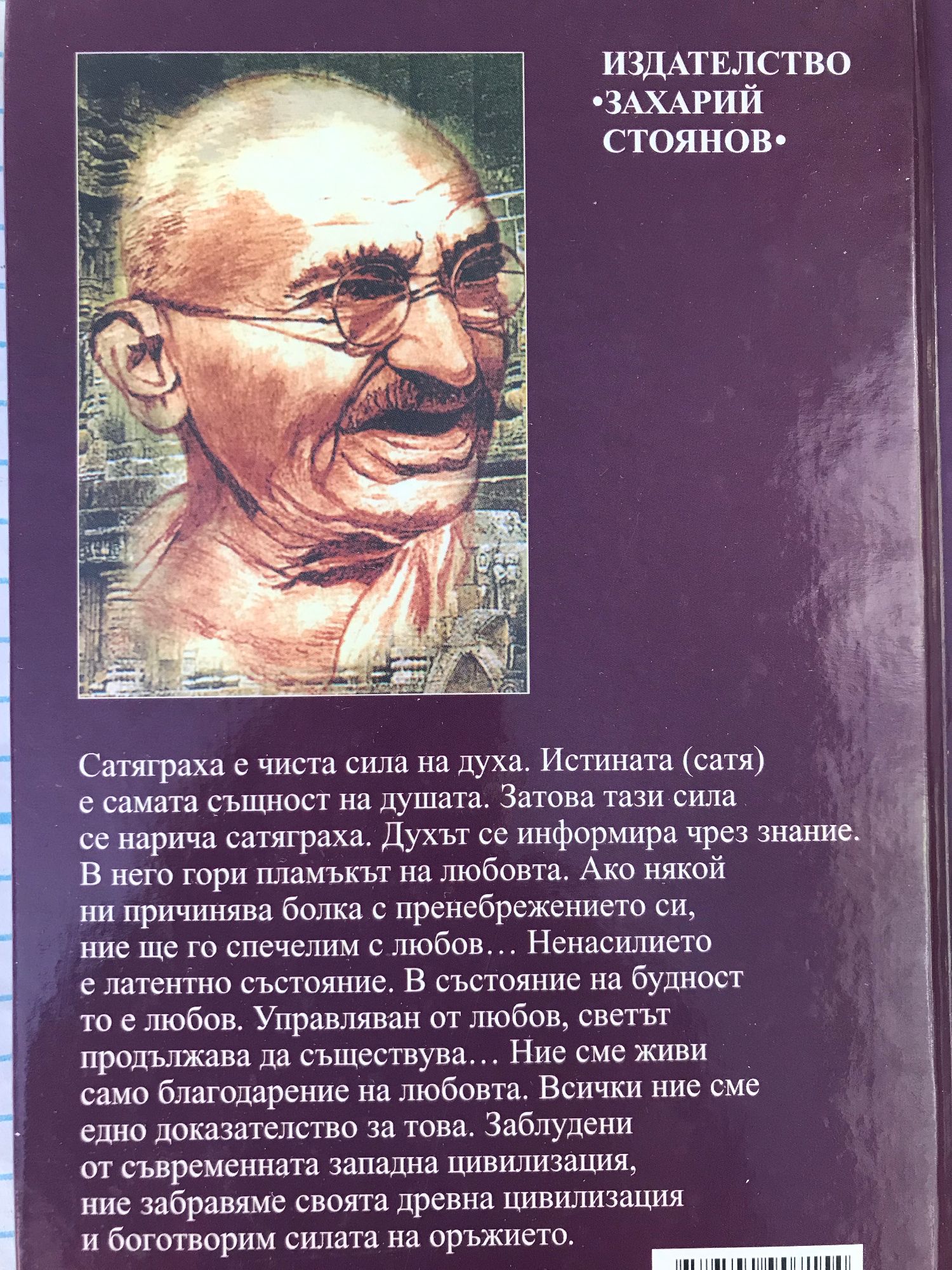 Сатяграха е чиста сила на духа. Истината (сатя) е самата същност на душата. Затова тази сила се нарича сатяграха. Духът се информира чрез знание. В него гори пламъкът на любовта. Ако някой ни причинява болка с пренебрежението си, ние ще го спечелим с любов... Ненасилието е латентно състояние. В състояние на будност то е любов. Управляван от любов, светът продължава да съществува... Ние сме живи само благодарение на любовта. Всички ние сме едно доказателство за това. Заблудени от съвременната западна цивилизация, ние забравяме своята древна цивилизация и боготворим силата на оръжието." Махатма Ганди