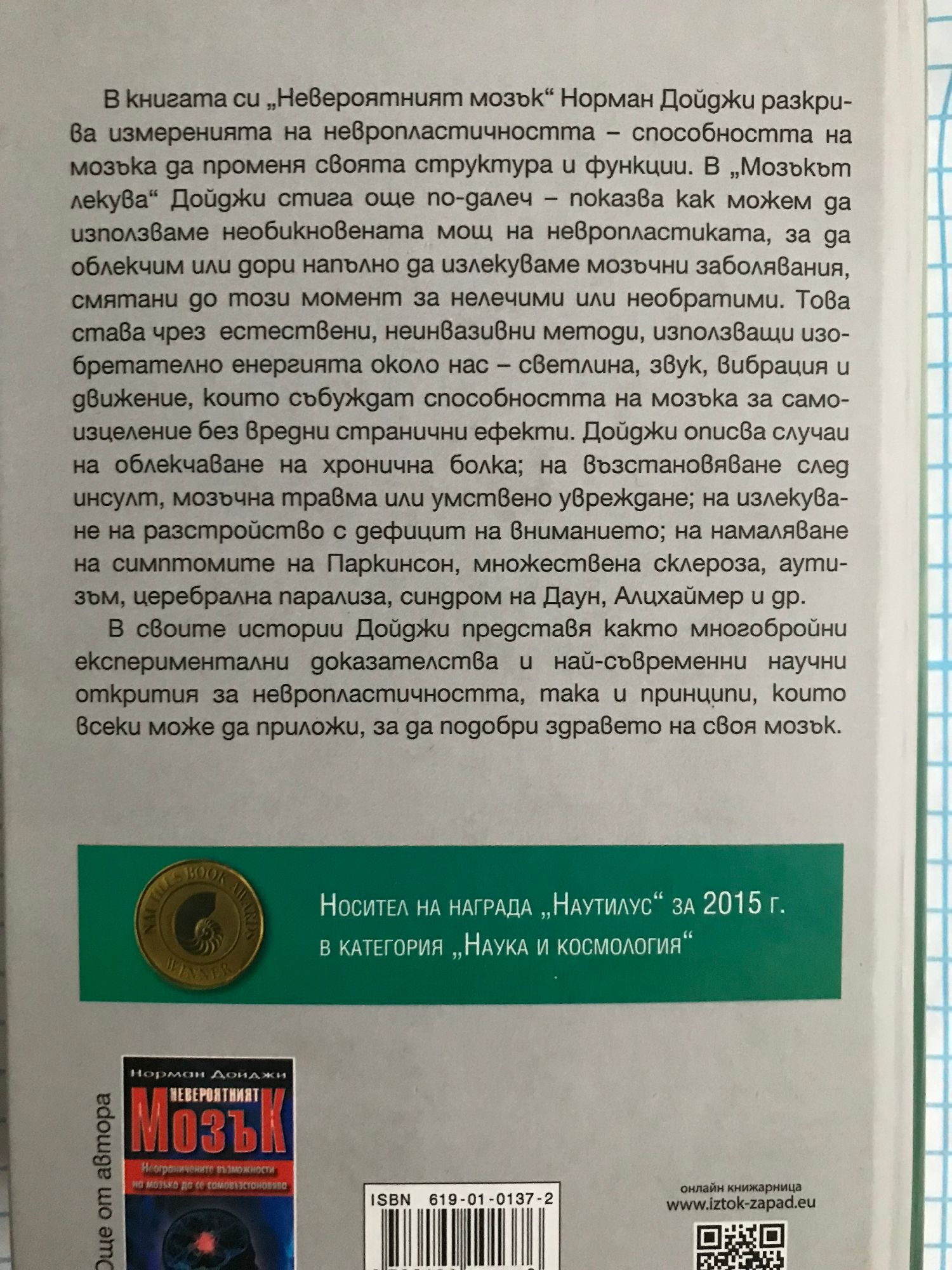 В книгата си "Невероятният мозък" Норман Дойджи разкрива измеренията на невропластичността - способността на мозъка да променя себе си, за да осигури нормални условия за пълноценен живот на човека. В новата си книга Дойджи стига още по-далеч - показва как можем да използваме необикновената мощ на невропластиката, за да облекчим или дори напълно да излекуваме мозъчни заболявания, смятани до този момент за нелечими или необратими. Това става чрез използването на естествени, неинвазивни методи за проникване в мозъка чрез енергията около нас - светлина, звук, вибрация и движение, които събуждат способността на мозъка за самоизцеление без вредни странични ефекти. Дойджи описва случаи на облекчаване на хронична болка; на възстановяване след инсулт, мозъчна травма или умствено увреждане; на излекуване на разстройство с дефицит на вниманието; на намаляване на симптомите на паркинсон, множествена склероза, аутизъм, церебрална парализа, синдром на Даун, алцхаймер и др. Доскоро пациентът бе сведен до пасивен субект, безпомощен страничен наблюдател на сблъсъка между двамата велики противници - лекарят и болестта. Време е да осъзнаем невероятната способност за самоизцеление, скрита в нас самите. В своите истории Дойджи представя както многобройни експериментални доказателства и най-съвременни научни открития за невропластичността, така и принципи, които всеки може да приложи, за да подобри здравето на своя мозък.