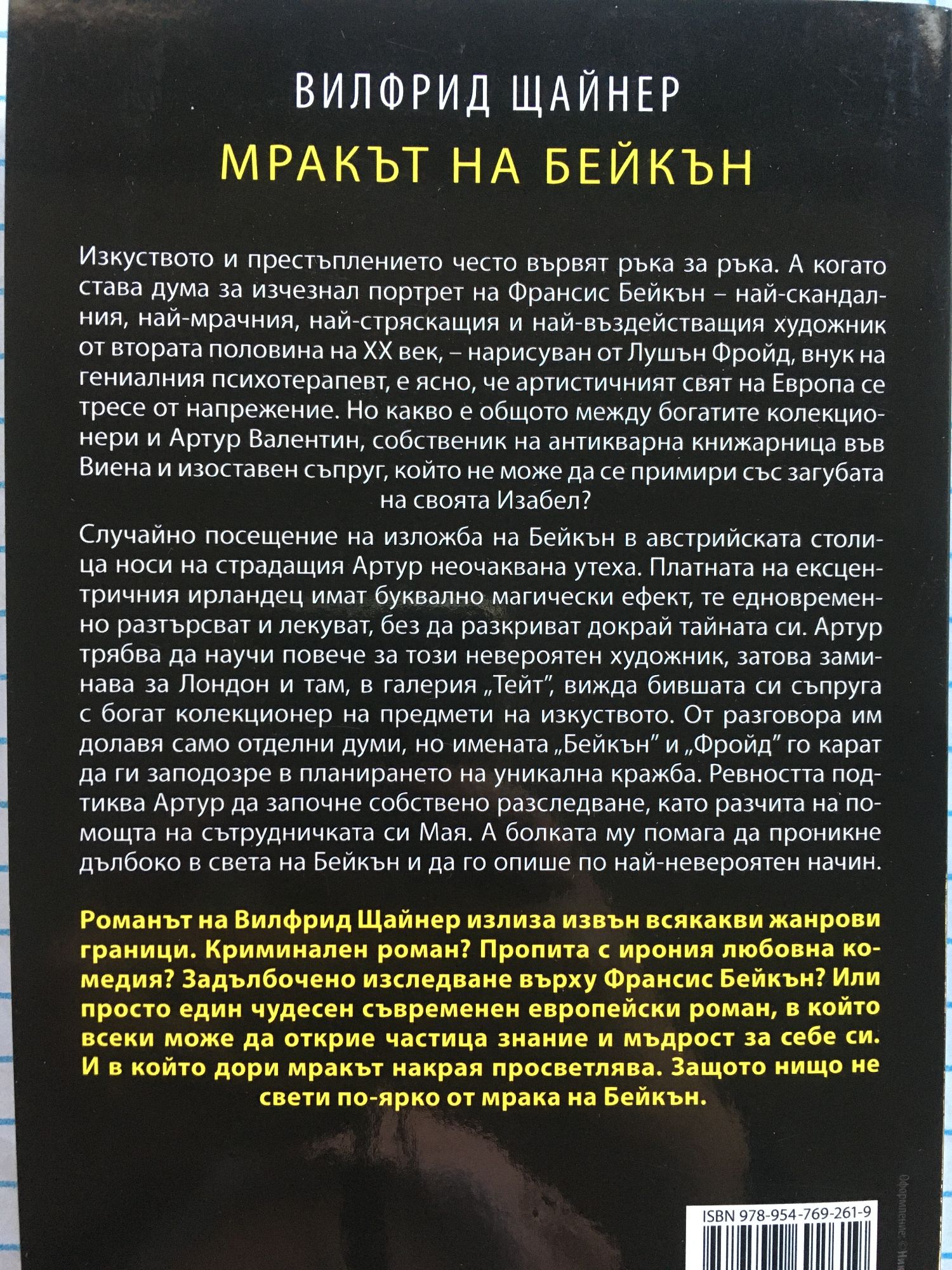 Изкуството и престъплението често вървят ръка за ръка. А когато става дума за изчезнал портрет на Франсис Бейкън – най-скандалния, най-мрачния, най-стряскащия и най-въздействащия художник от втората половина на XX век, - нарисуван от Лушън Фройд, внук на гениалния психотерапевт, е ясно, че артистичният свят на Европа се тресе от напрежение. Но какво е общото между богатите колекционери и Артур Валентин, собственик на антикварна книжарница във Виена и изоставен съпруг, който не може да се примири със загубата на своята Изабел? Случайно посещение на изложба на Бейкън в австрийската столица носи на страдащия Артур неочаквана утеха. Платната на ексцентричния ирландец имат буквално магически ефект, те едновременно разтърсват и лекуват, без да разкриват докрай тайната си. Артур трябва да научи повече за този невероятен художник, затова заминава за Лондон и там, в галерия „Тейт”, вижда бившата си съпруга с богат колекционер на предмети на изкуството. От разговора им долавя само отделни думи, но имената „Бейкън” и „Фройд” го карат да ги заподозре в планирането на уникална кражба. Ревността подтиква Артур да започне собствено разследване, като разчита на помощта на сътрудничката си Мая. А болката му помага да проникне дълбоко в света на Бейкън и да го опише по най-невероятен начин. Изключително свеж и интелигентен европейски роман, който се чете като трилър, разчувства като романтична драма и образова като художествена студия. Романът на Вилфрид Щайнер излиза извън всякакви жанрови граници. Криминален роман? Пропита с ирония любовна комедия? Задълбочено изследване върху Франсис Бейкън? Или просто един чудесен съвременен европейски роман, в който всеки може да открие частица знание и мъдрост за себе си. И в който дори мракът накрая просветлява. Защото, както казва Мая, „нищо не свети по-ярко от мрака на Бейкън”.