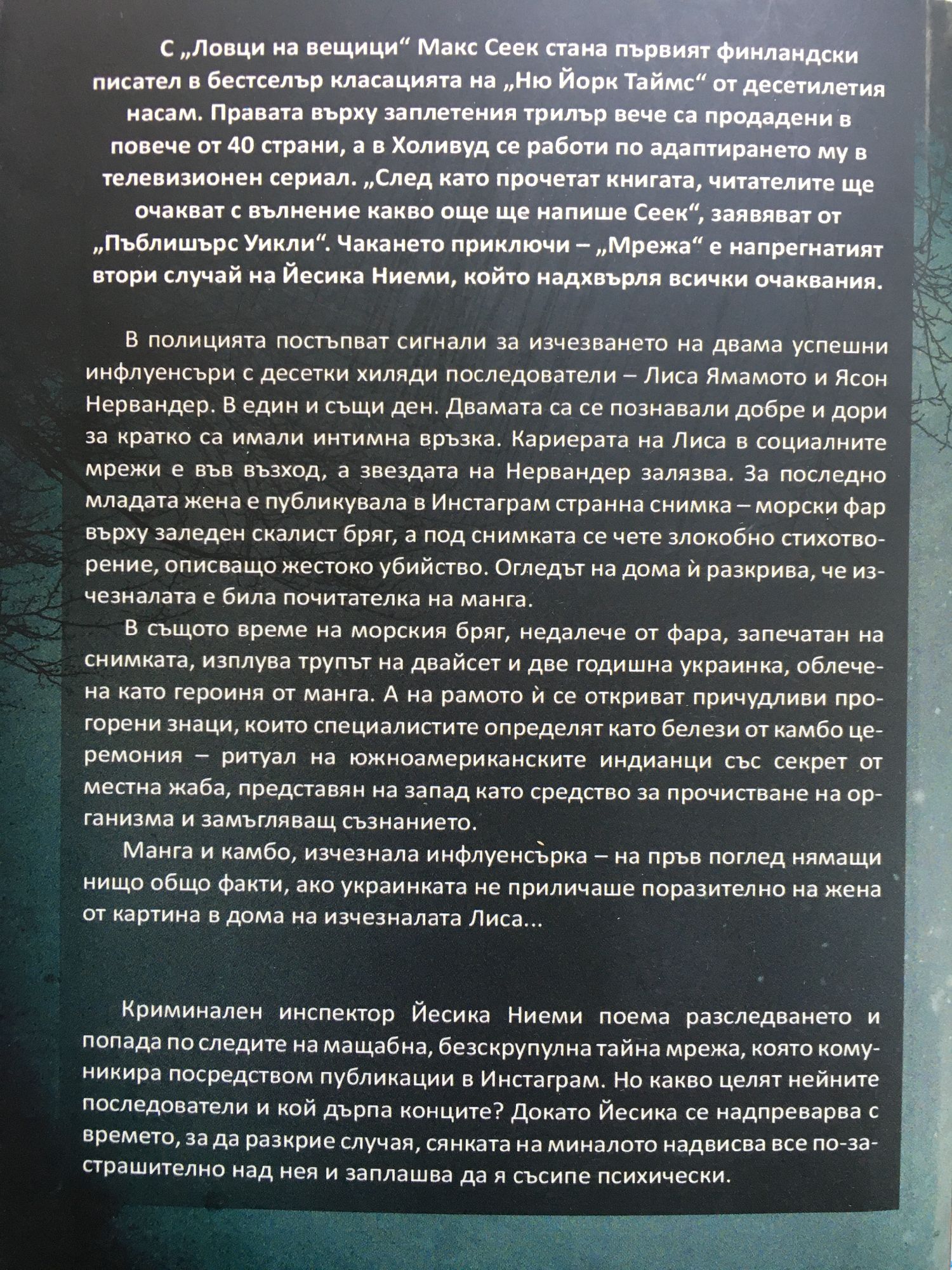 С „Ловци на вещици“ Макс Сеек стана първият финландски писател в бестселър класацията на „Ню Йорк Таймс“ от десетилетия насам. Правата върху заплетения трилър вече са продадени в повече от 40 страни, а в Холивуд се работи по адаптирането му в телевизионен сериал. „След като прочетат книгата, читателите ще очакват с вълнение какво още ще напише Сеек“, заявяват от „Пъблишърс Уикли“. Чакането приключи – „Мрежа“ е напрегнатият втори случай на Йесика Ниеми, който надхвърля всички очаквания. В полицията постъпват сигнали за изчезването на двама успешни инфлуенсъри с десетки хиляди последователи – Лиса Ямамото и Ясон Нервандер. В един и същи ден. Двамата са се познавали добре и дори за кратко са имали интимна връзка. Кариерата на Лиса в социалните мрежи е във възход, а звездата на Нервандер залязва. За последно младата жена е публикувала в Инстаграм странна снимка – морски фар върху заледен скалист бряг, а под снимката се чете злокобно стихотворение, описващо жестоко убийство. Огледът на дома ? разкрива, че изчезналата е била почитателка на манга. В същото време на морския бряг, недалече от фара, запечатан на снимката, изплува трупът на двайсет и две годишна украинка, облечена като героиня от манга. А на рамото ? се откриват причудливи прогорени знаци, които специалистите определят като белези от камбо церемония – ритуал на южноамериканските индианци със секрет от местна жаба, представян на запад като средство за прочистване на организма и замъгляващ съзнанието. Манга и камбо, изчезнала инфлуенсърка – на пръв поглед нямащи нищо общо факти, ако украинката не приличаше поразително на жена от картина в дома на изчезналата Лиса...