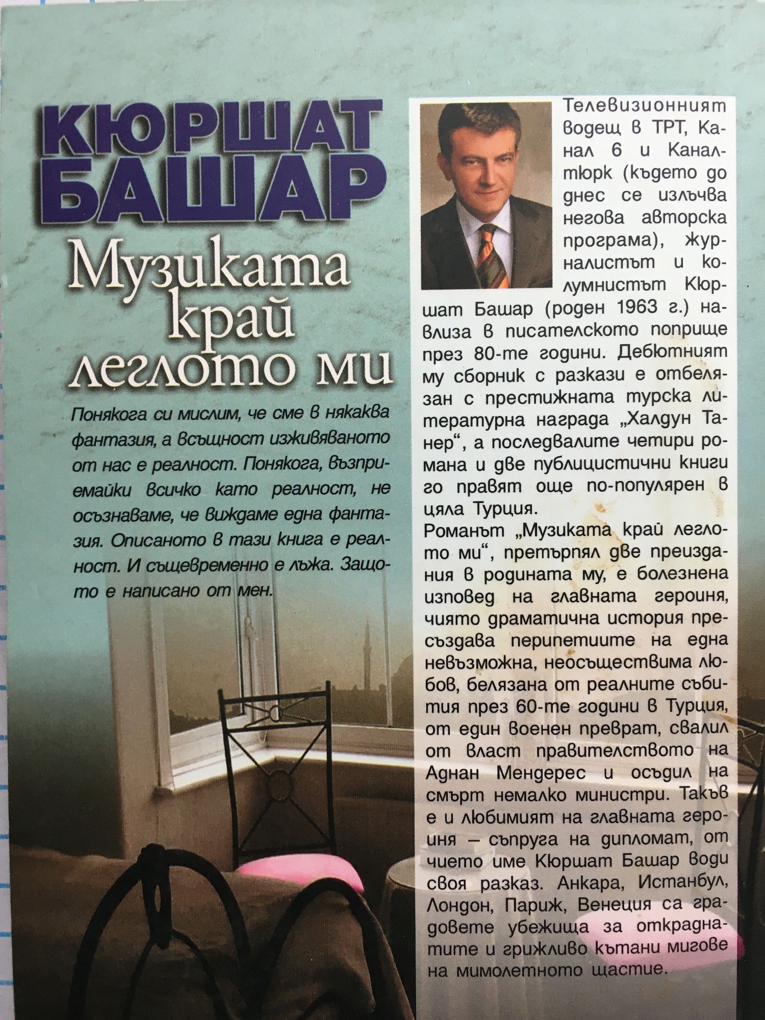 „Музиката край леглото ми“, претърпял две преиздания в родината на автора, е болезнена изповед на главната героиня, чиято драматична история пресъздава перипетиите на една невъзможна, неосъществима любов, белязана от реалните събития през 60-те години в Турция, от един военен преврат, свалил от власт правителството на Аднан Мендерес и осъдил на смърт немалко министри. Такъв е и любимият на главната героиня - съпруга на дипломат, от чието име Кюршат Башар води своя разказ. Анкара, Истанбул, Лондон, Париж, Венеция са градовете убежища за откраднатите и грижливо кътани мигове на мимолетното щастие. Понякога си мислим, че сме в някаква фантазия, а всъщност изживяваното от нас е реалност. Понякога, възприемайки всичко като реалност, не осъзнаваме, че виждаме една фантазия. Описаното в тази книга е реалност. И същевременно е лъжа. Защото е написано от мен.