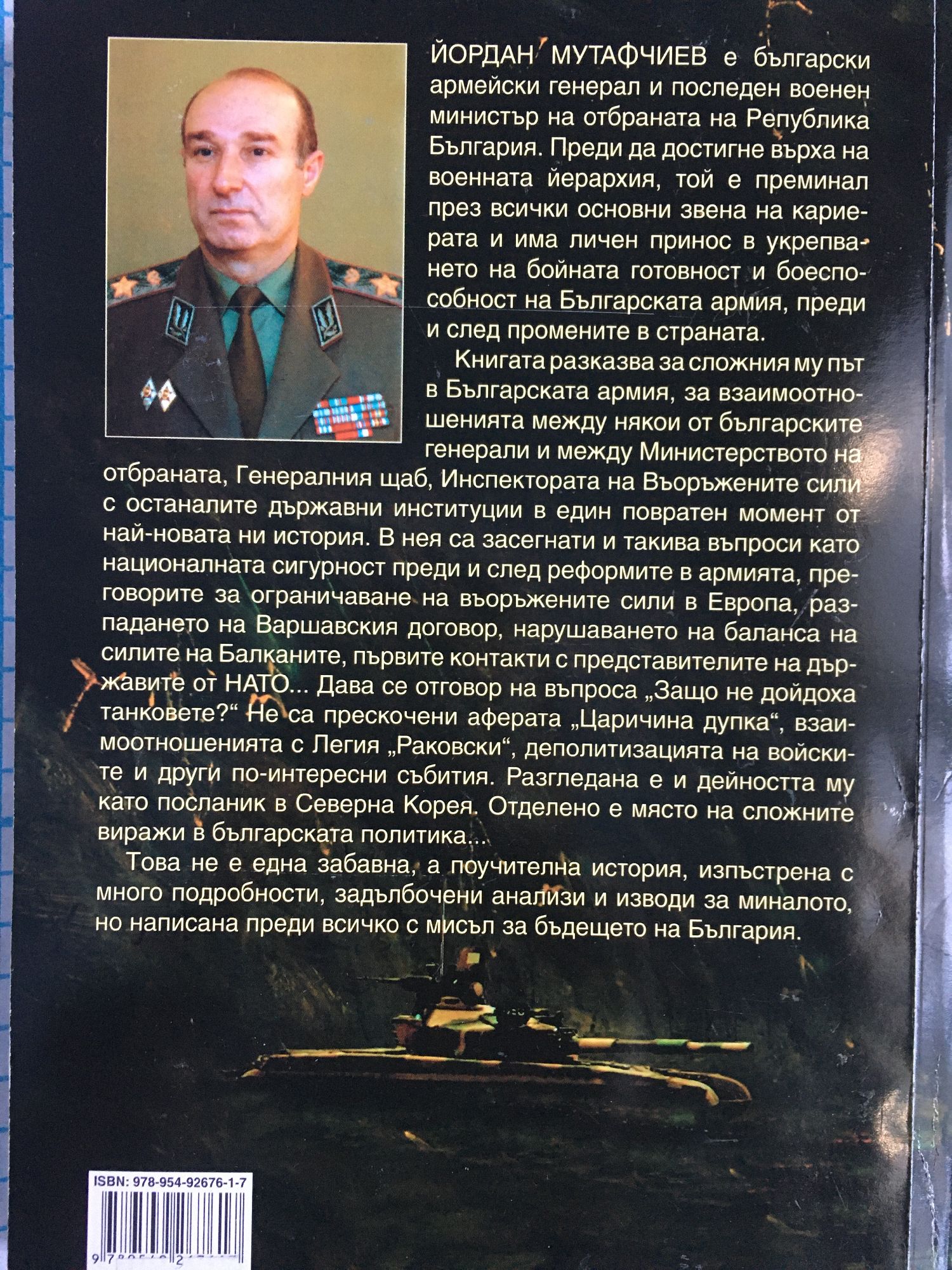 ЙОРДАН МУТАФЧИЕВ е български армейски генерал и последен военен министър на отбраната на Република България. Преди да достигне върха на военната йерархия, той е преминал през всички основни звена на кариерата и има личен принос в укрепването на бойната готовност и боеспособност на Българската армия, преди и след промените в страната. Книгата разказва за сложния му път в Българската армия, за взаимоотношенията между някои от българските генерали и между Министерството на отбраната, Генералния щаб, Инспектората на Въоръжените сили с останалите държавни институции в един повратен момент от най-новата ни история. В нея са засегнати и такива въпроси като националната сигурност преди и след реформите в армията, преговорите за ограничаване на въоръжените сили в Европа, разпадането на Варшавския договор, нарушаването на баланса на силите на Балканите, първите контакти с представителите на държавите от НАТО... Дава се отговор на въпроса „Защо не дойдоха танковете?" Не са прескочени аферата „Царичина дупка", взаимоотношенията с Легия „Раковски", деполитизацията на войските и други по-интересни събития. Разгледана е и дейността му като посланик в Северна Корея. Отделено е място на сложните виражи в българската политика... Това не е една забавна, а поучителна история, изпъстрена с много подробности, задълбочени анализи и изводи за миналото, но написана преди всичко с мисъл за бъдещето на България.