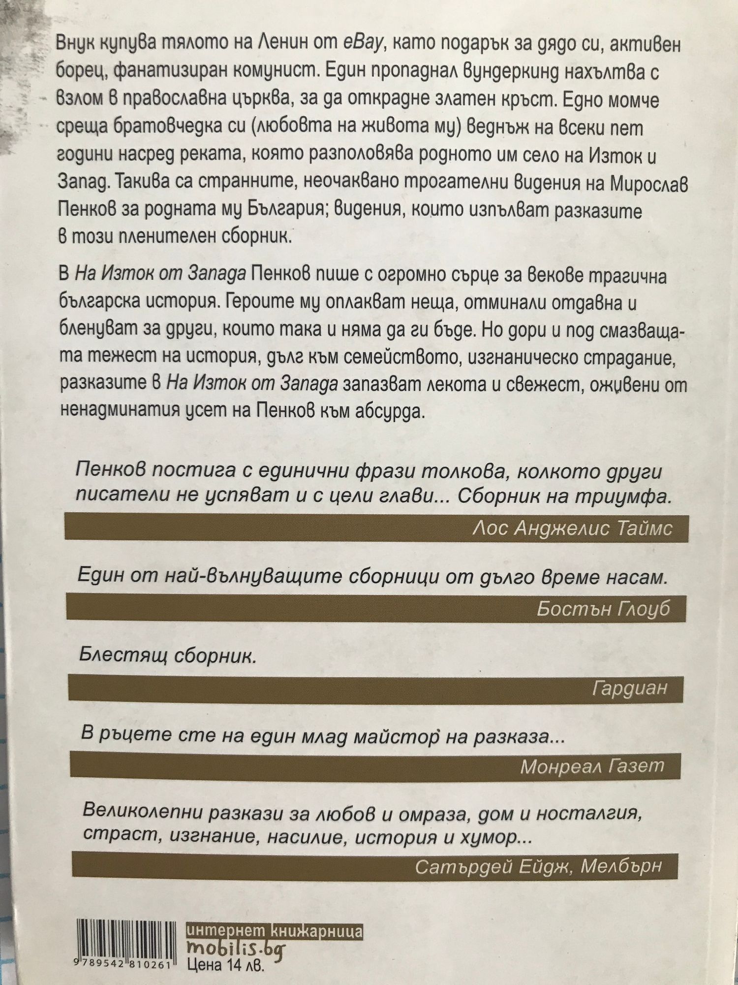 Внук купува тялото на Ленин от eBay, като подарък за дядо си, активен борец, фанатизиран комунист. Един пропаднал вундеркинд нахълтва с взлом в православна църква, за да открадне златен кръст. Едно момче среща братовчедка си /любовта на живота му/ веднъж на всеки пет години насред реката, която разполовява родното им село на Изток и Запад. Такива са странните, неочаквано трогателни видения на Мирослав Пенков за родната му България; видения, които изпълват разказите в този пленителен сборник. В "На Изток от Запада" Пенков пише с огромно сърце за векове трагична българска история. Героите му оплакват неща, отминали отдавна и бленуват за други, които така и няма да ги бъде. Но дори и под смазващата тежест на история, дълг към семейството, изгнаническо страдание, разказите в "На Изток от Запада" запазват лекота и свежест, оживени от ненадминатия усет на Пенков към абсурда.