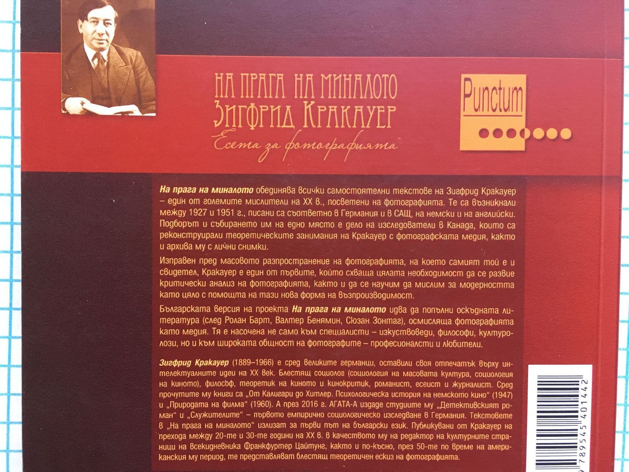 "На прага на миналото" обединява всички самостоятелни текстове на Зигфрид Кракауер - един от големите мислители на XX в., посветени на фотографията. Те са възникнали между 1927 и 1951 г., писани са съответно в Германия и в САЩ, на немски и на английски. Подборът и събирането им на едно място е дело на изследователи в Канада, които са реконструирали теоретическите занимания на Кракауер с фотографската медия, както и архива му с лични снимки. Изправен пред масовото разпространение на фотографията, на което самият той е и свидетел, Кракауер е един от първите, който схваща цялата необходимост да се развие критически анализ на фотографията, както и да се научим да мислим за модерността като цяло с помощта на тази нова форма на възпроизводимост. Българската версия на проекта "На прага на миналото" идва да попълни оскъдната литература (след Ролан Барт, Валтер Бенямин, Сюзан Зонтаг), осмисляща фотографията като медия. Тя е насочена не само към специалисти - изкуствоведи, философи, културолози, но и към широката общност на фотографите - професионалсти и любители. Зигфрид Кракауер (1889 - 1966) е сред великите германци, оставили своя отпечатък върху интелектуалните идеи на XX век. Блестящ социолог (социология на масовата култура, социология на киното), философ, теоретик на киното и кинокритик, романист, есеист и журналист. Сред прочутите му книги са "От Калигари до Хитлер. Психологическа история на немското кино" (1947) и "Природата на филма" (1960). А през 2016 г. "Агата-А" издаде студиите му "Детективският роман" и "Служителите" - първото емпирично социологическо изследване в Германия. Текстовете в "На прага на миналото" излизат за първи път на български език. Публикувани от Кракауер на прехода между 20-те и 30-те години на XX в. в качеството му на редактор на културните страници на всекидневника Франкфуртер Цайтунг, както и по-късно, през 50-те по време на американския му период, те представляват блестящ теоретичен ескиз на фотографията.