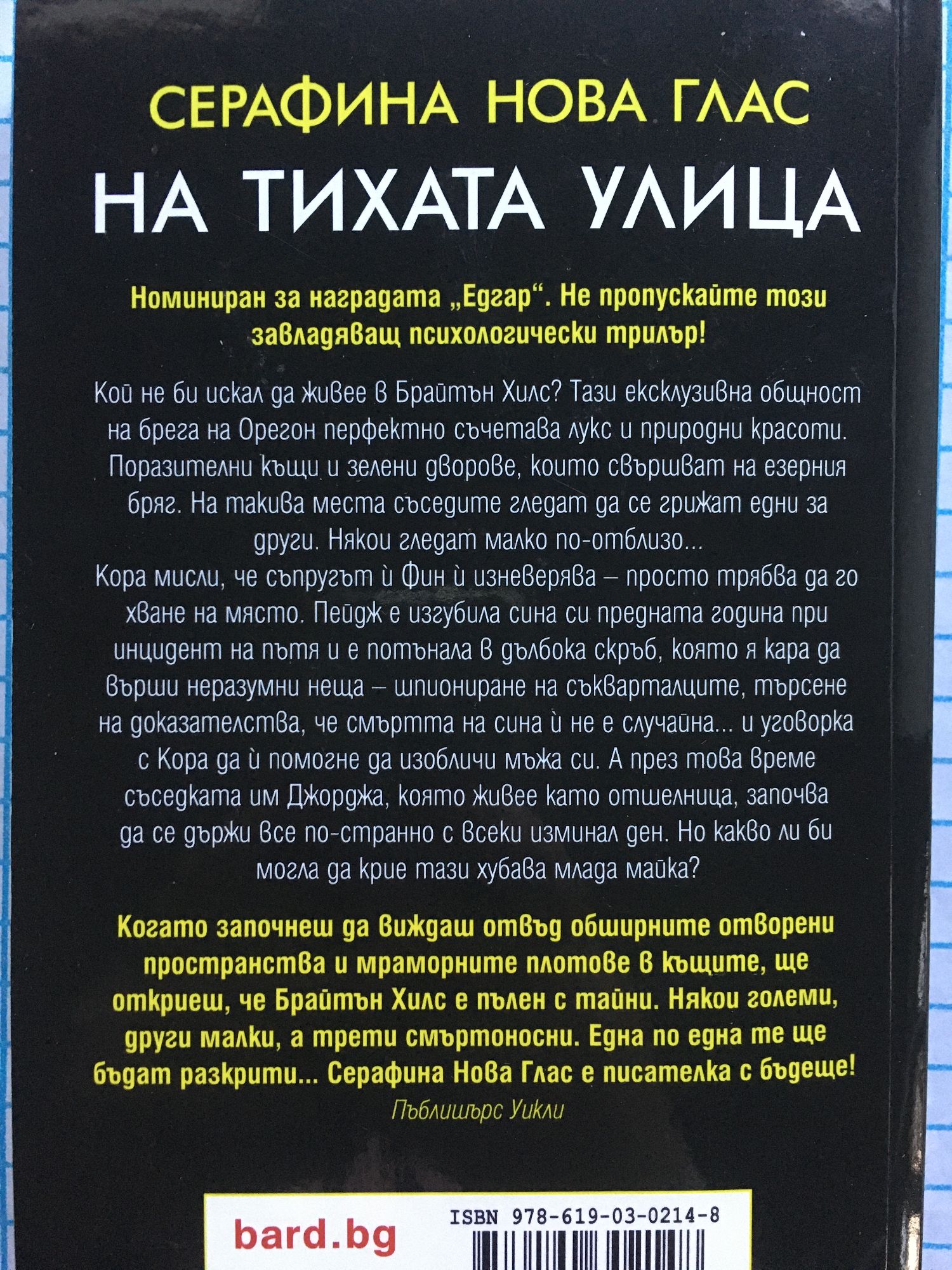 Идеалният квартал е идеалното място да се скриеш... Номиниран за наградата „Едгар“. Не пропускайте този завладяващ психологически трилър! Кой не би искал да живее в Брайтън Хилс? Тази ексклузивна общност на брега на Орегон перфектно съчетава лукс и природни красоти. Поразителни къщи и зелени дворове, които свършват на езерния бряг. На такива места съседите гледат да се грижат едни за други. Някои гледат малко по-отблизо... Кора мисли, че съпругът й Фин й изневерява – просто трябва да го хване на място. Пейдж е изгубила сина си предната година при инцидент на пътя и е потънала в дълбока скръб, която я кара да върши неразумни неща – шпиониране на съкварталците, търсене на доказателства, че смъртта на сина й не е случайна... и уговорка с Кора да й помогне да изобличи мъжа си. А през това време съседката им Джорджа, която живее като отшелница, започва да се държи все по-странно с всеки изминал ден. Но какво ли би могла да крие тази хубава млада майка? Когато започнеш да виждаш отвъд обширните отворени пространства и мраморните плотове в къщите, ще откриеш, че Брайтън Хилс е пълен с тайни. Някои големи, други малки, а трети смъртоносни. Една по една те ще бъдат разкрити... Серафина Нова Глас е писателка с бъдеще! Пъблишърс Уикли