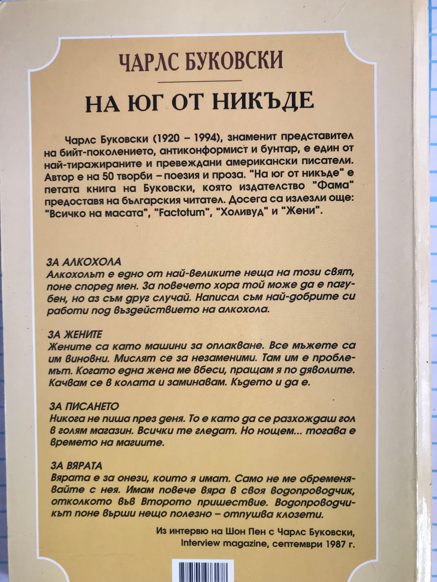 Чарлс Буковски (1920 - 1994), знаменит представител на бийт-поколението, антиконформист и бунтар, е един от най-тиражираните и превеждани американски писатели. Автор е на 50 творби - поезия и проза. "На юг от никъде" е петата книга на Буковски, която издателство "Фама" предоставя на българския читател. Досега са излезли още: "Всичко на масата", "Factotum", "Холивуд" и "Жени". ЗА АЛКОХОЛА Алкохолът е едно от най-великите неща на този свят, поне според мен. За повечето хора той може да е пагубен, но аз съм друг случай. Написал съм най-добрите си работи под въздействието на алкохола. ЗА ЖЕНИТЕ Жените са като машини за оплакване. Все мъжете са им виновни. Мислят се за незаменими. Там им е проблемът. Когато една жена ме вбеси, пращам я по дяволите. Качвам се в колата и заминавам. Където и да е. ЗА ПИСАНЕТО Никога не пиша през деня. То е като да се разхождаш гол в голям магазин. Всички те гледат. Но нощем... тогава е времето на магиите. ЗА ВЯРАТА Вярата е за онези, които я имат. Само не ме обременявайте с нея. Имам повече вяра в своя водопроводчик, отколкото във Второто пришествие. Водопроводчикът поне върши нещо полезно - отпушва клозети. Из интервю на Шон Пен с Чарлс Буковски, Interview magazine, септември 1987 г.
