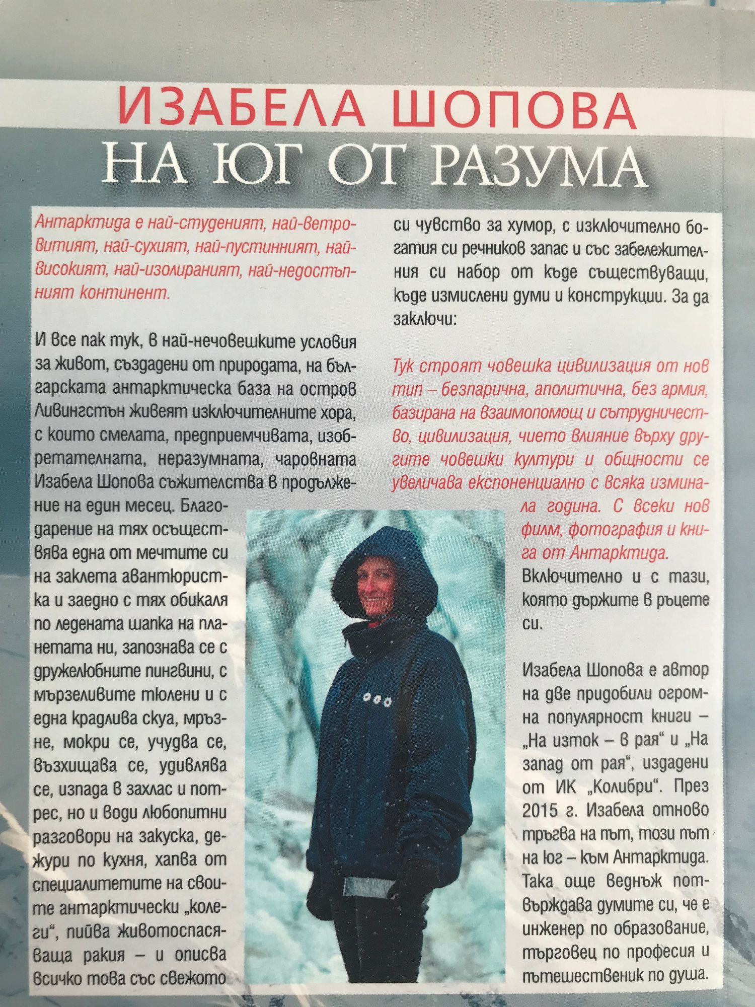 И все пак тук, в най-нечовешките условия за живот, създадени от природата, на българската антарктическа база на остров Ливингстън живеят изключителните хора, с които смелата, предприемчивата, изобретателната, неразумната, чаровната Изабела Шопова съжителства в продължение на един месец. Благодарение на тях осъществява една от мечтите си на заклета авантюристка и заедно с тях обикаля по ледената шапка на планетата ни, запознава се с дружелюбните пингвини, с мързеливите тюлени и с една крадлива скуа, мръзне, мокри се, учудва се, възхищава се, удивлява се, изпада в захлас и потрес, но и води любопитни разговори на закуска, дежури по кухня, хапва от специалитетите на своите антарктически "колеги", пийва животоспасяваща ракия - и описва всичко това със свежото си чувство за хумор, с изключително богатия си речников запас и със забележителния си набор от къде съществуващи, къде измислени думи и конструкции. За да заключи: