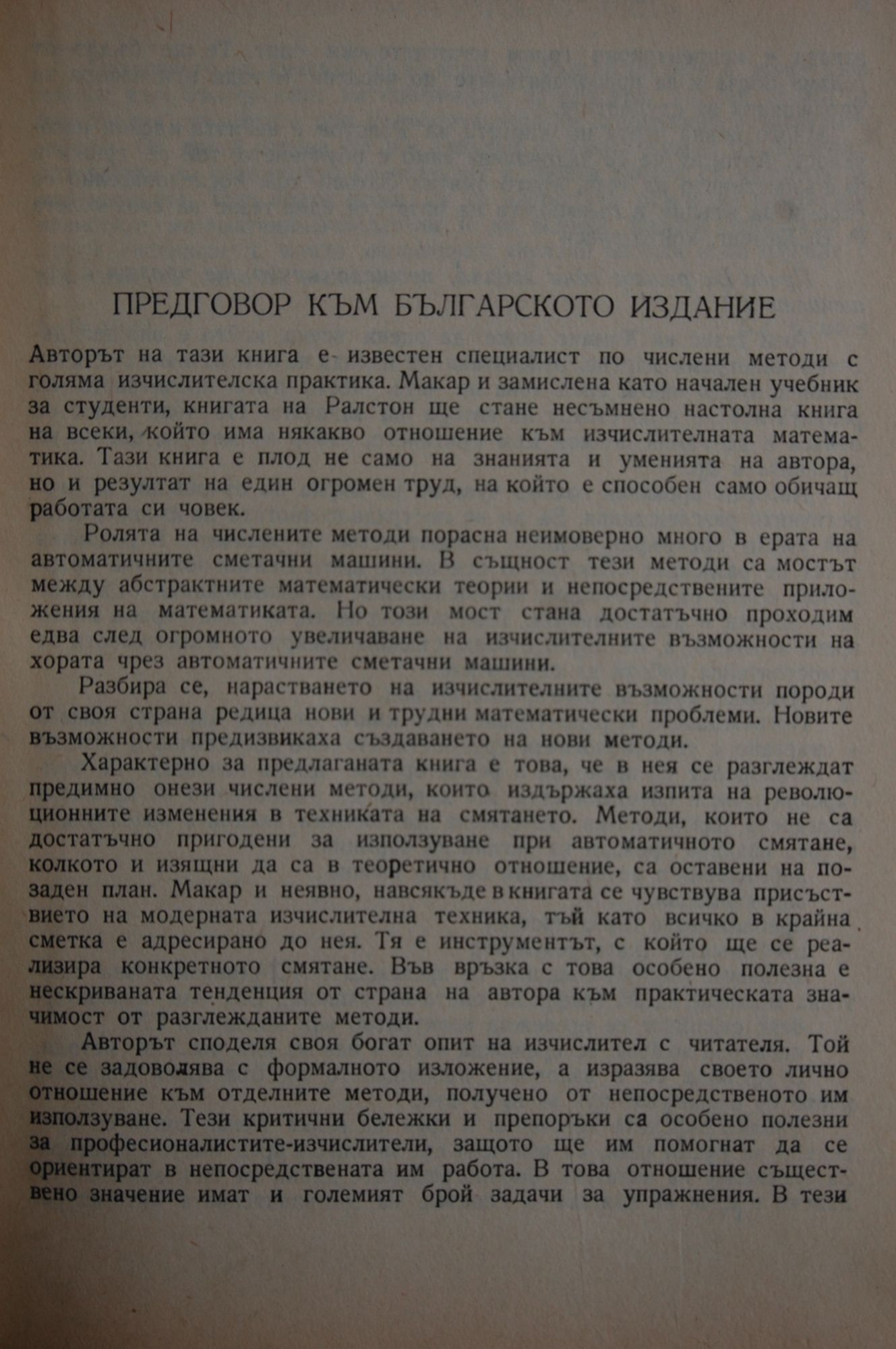Авторът на тази книга е известен специалист по числени методи с голяма изчислителска практика. Макар и замислена като начален учебник за студенти, книгата на Ралстон ще стане несъмнено настолна книга на всеки, който има някакво отношение към изчислителната математика.