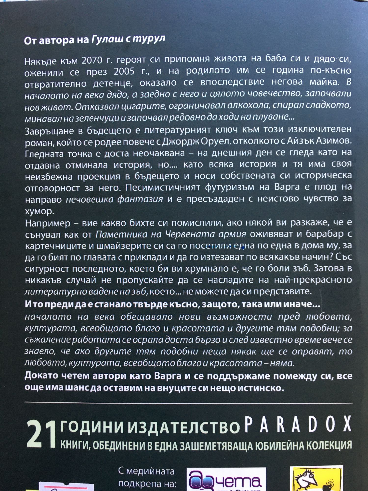 Някъде към 2070 г. героят си припомня живота на баба си и дядо си, оженили се през 2005 г., и на родилото им се година по-късно отвратително детенце, оказало се впоследствие негова майка. Завръщане в бъдещето е литературният ключ към този изключителен роман, който се родее повече с Джордж Оруел, отколкото с Айзък Азимов. Гледната точка е доста неочаквана – на днешния ден се гледа като на отдавна отминала история, но…. като всяка история и тя има своя неизбежна проекция в бъдещето и носи собствената си историческа отговорност за него. Песимистичният футуризъм на Варга е плод на направо нечовешка фантазия и е пресъздаден с неистово чувство за хумор. Например – вие какво бихте си помислили, ако някой ви разкаже, че е сънувал как от Паметника на Червената армия оживяват и барабар с картечниците и шмайзерите си са го посетили една по една в дома му, за да го бият по главата с приклади и да го изтезават по всякакъв начин? Със сигурност последното, което би ви хрумнало е, че го боли зъб. Затова в никакъв случай не пропускайте да се насладите на най-прекрасното литературно вадене на зъб, което… не можете да си представите. И то преди да е станало твърде късно, защото, така или иначе… началото на века обещавало нови възможности пред любовта, културата, всеобщото благо и красотата и другите тям подобни; за съжаление работата се осрала доста бързо и след известно време вече се знаело, че ако другите тям подобни неща някак ще се оправят, то любовта, културата, всеобщото благо и красотата – няма. Докато четем автори като Варга и се подкрепяме помежду си, все още има шанс да оставим на внуците си нещо истинско.