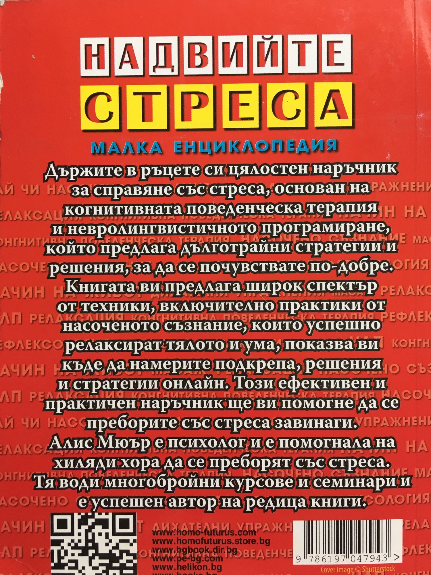 Държите в ръцете си цялостен наръчник за справяне със стреса, основан на когнитивната поведенческа терапия и невролингвистичното програмиране, който предлага дълготрайни стратегии и решения, за да се почувствате по-добре. Книгата ви предлага широк спектър от техники, включително практики от насоченото съзнание, които успешно релаксират тялото и ума, показва ви къде да намерите подкрепа, решения и стратегии онлайн. Този ефективен и практичен наръчник ще ви помогне да се преборите със стреса завинаги. Алис Мюър е психолог и е помогнала на хиляди хора да се преборят със стреса. Тя води многобройни курсове и семинари и е успешен автор на редица книги.