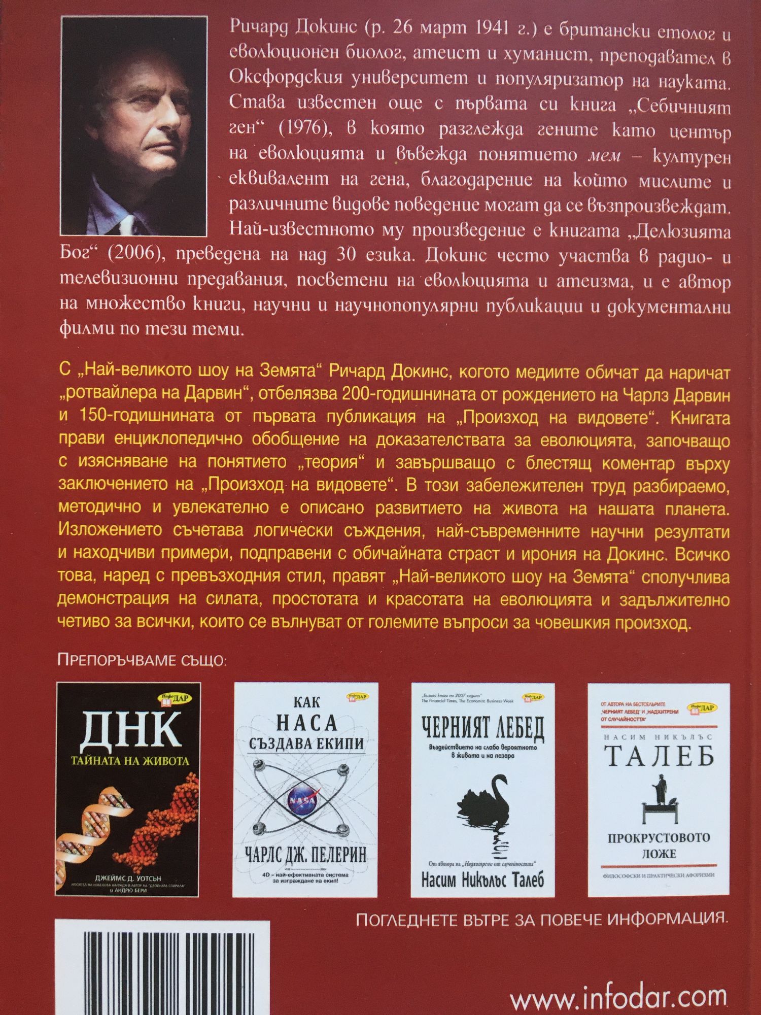 С "Най-великото шоу на Земята" Ричард Докинс, когото медиите обичат да наричат "ротвайлера на Дарвин", отбелязва 200-годишнината от рождението на Чарлз Дарвин и 150-годишнината от първата публикация на "Произход на видовете". Книгата прави енциклопедично обобщение на доказателствата за еволюцията, започващо с изясняване на понятието "теория" и завършващо с блестящ коментар върху заключението на "Произход на видовете". В този забележителен труд разбираемо, методично и увлекателно е описано развитието на живота на нашата планета. Изложението съчетава логически съждения, най-съвременните научни резултати и находчиви примери, подправени с обичайната страст и ирония на Докинс. Всичко това, наред с превъзходния стил, правят "Най-великото шоу на Земята" сполучлива демонстрация на силата, простотата и красотата на еволюцията и задължително четиво за всички, които се вълнуват от големите въпроси за човешкия произход.
