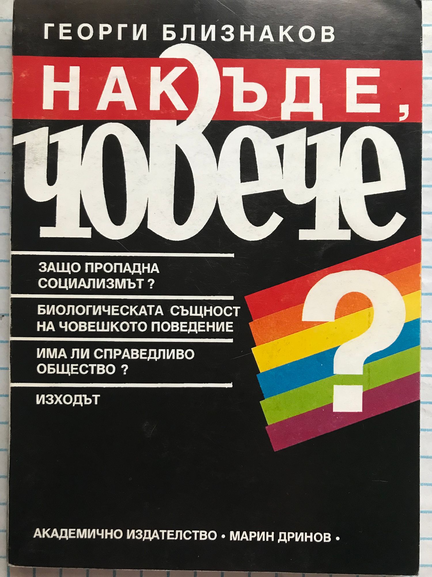 Пред вас е книгата на един неспециалист, както определя сам себе си акад. Близнаков-нито философ, нито безбожник, а човек, който като много хора днес освен в тясната си специалност(физикохимия) се интересува от процесите в заобикалящия ни свят. Част от написаното ще се стори елементарно и известно на просветения читател, но това не притеснява автора. Та нали през последните години израснаха много млади хора, които доскоро бяха деца и малко знаят за това, за което става дума в книгата. Те още не са се опитвали да правят някои сравнения, пък и не могат. Авторът ще е доволен, ако научат нещо от него. "Накъде, човече?" е книга за хората, търсещи истината в един объркан и разочарован свят.