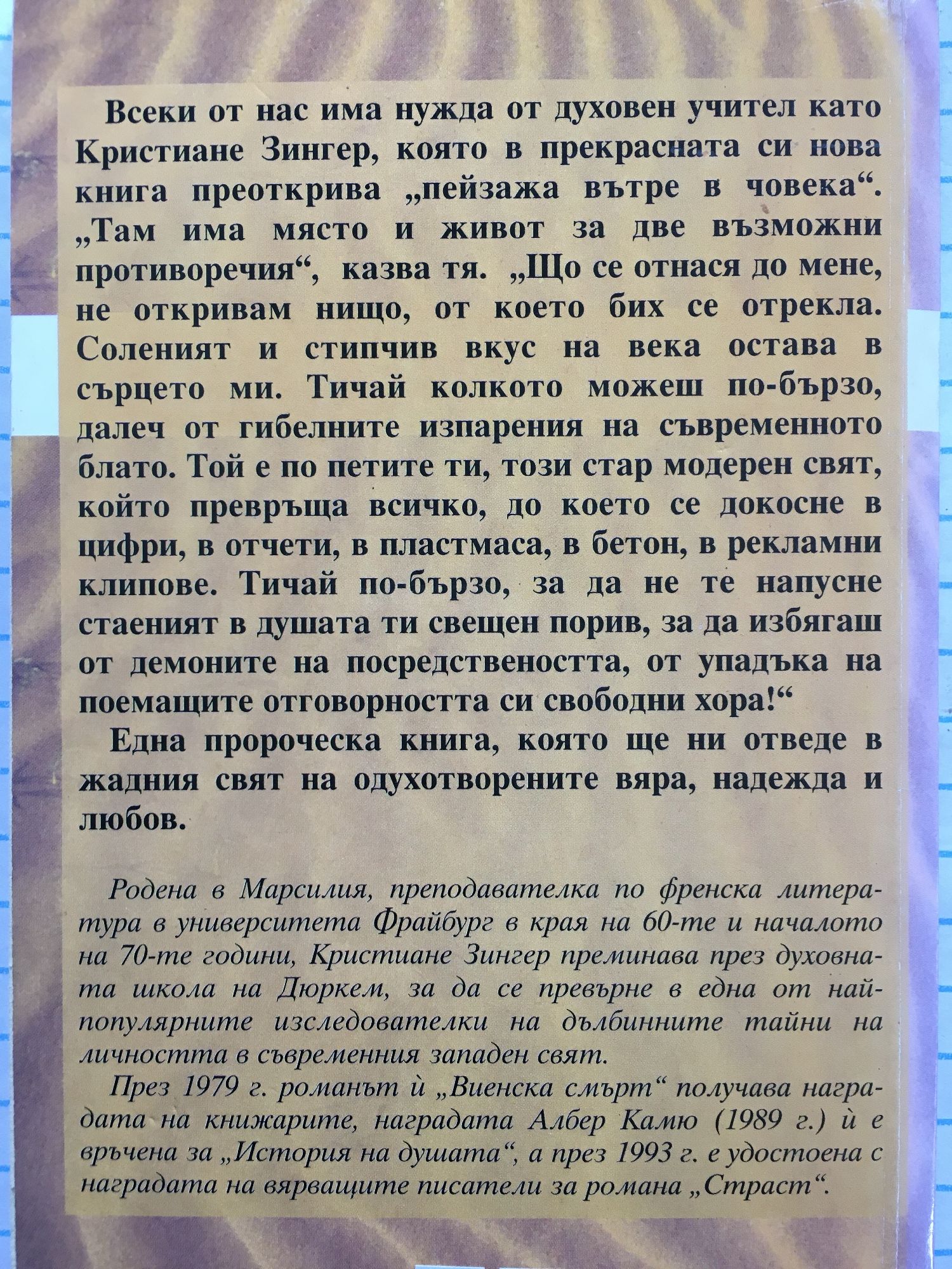 Всеки от нас има нужда от духовен учител като Кристиане Зингер, която в прекрасната си нова книга преоткрива "пейзажа вътре в човека". "Там има място и живот за две възможни противоречия", казва тя. "Що се отнася до мен, не откривам нищо, от което бих се отрекла. Соленият и стипчив вкус на века остава в сърцето ми. Тичай колкото можеш по-бързо, далеч от гибелните изпарения на съвременното блато. Той е по петите ти, този стар модерен свят, който превръща всичко, до което се докосне в цифри, в отчети, в пластмаса, в бетон, в рекламни клипове. Тичай по-бързо, за да не те напусне стаеният в душата ти свещен порив, за да избягаш от демоните на посредствеността, от упадъка на поемащите отговорността си свободни хора!" Една пророческа книга, която ще ни отведе в жадния свят на одухотворените вяра, надежда и любов.