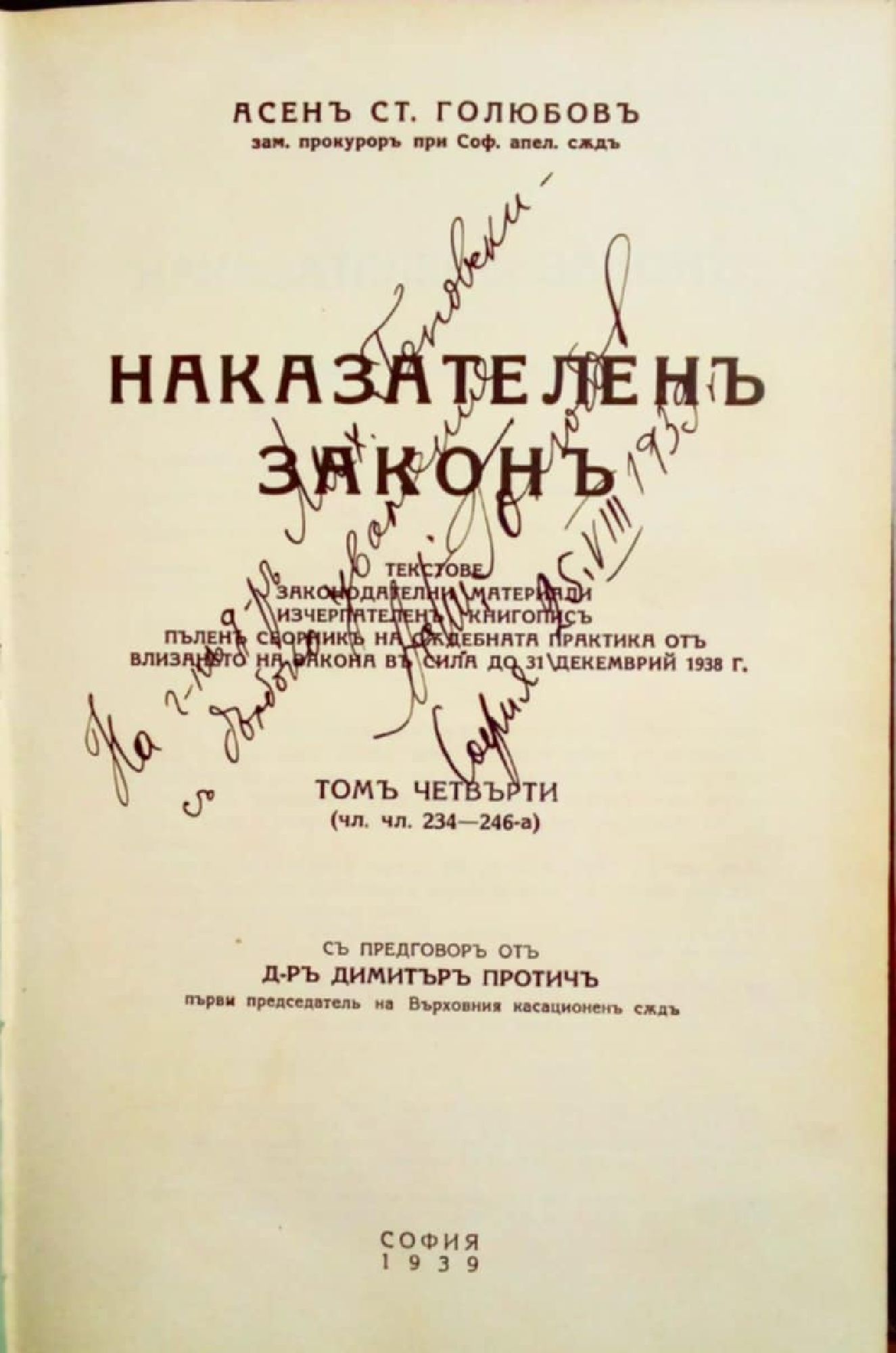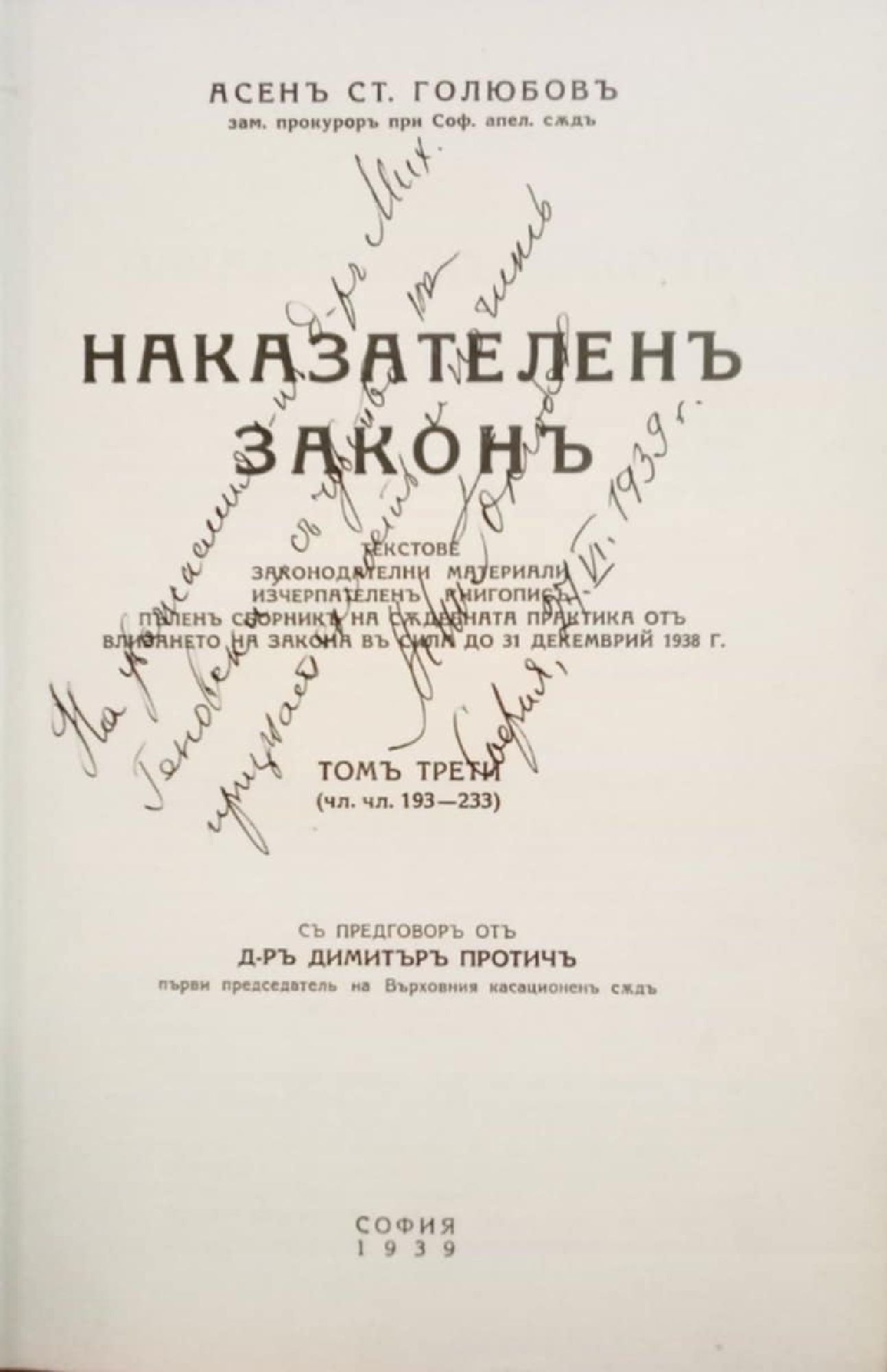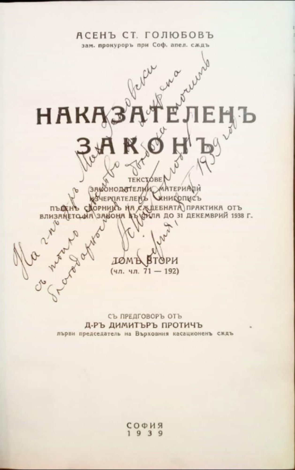 (чл. чл. 71 - 544) Текстове, законодателни материали, изчерпателенъ книгописъ, пъленъ сборникъ на съдебната практика от влизането на закона въ сила до 31 декемврий 1939 г.