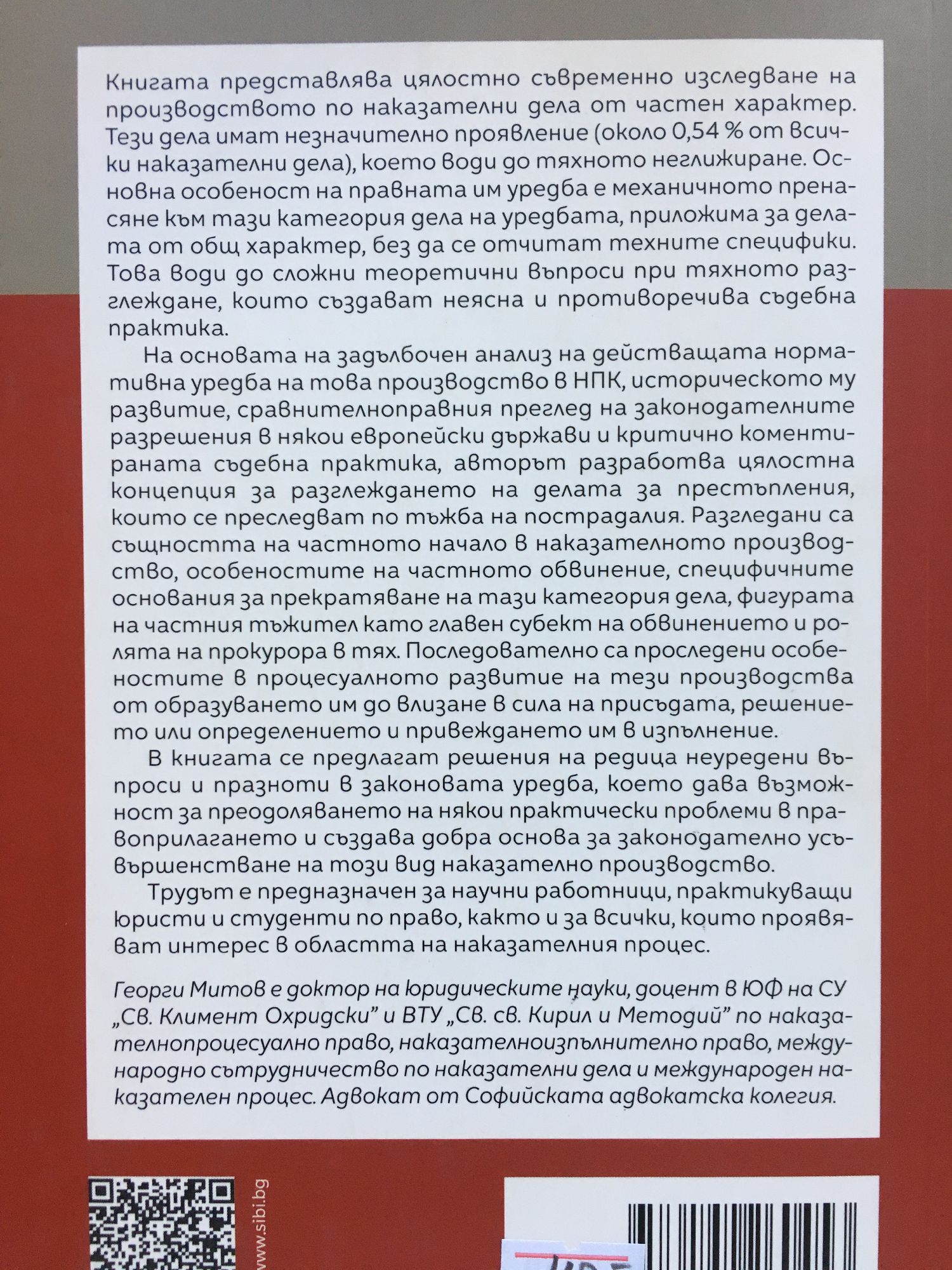 Книгата представлява цялостно съвременно изследване на производството по наказателни дела от частен характер. Тези дела имат незначително проявление (около 0,54 % от всички наказателни дела), което води до тяхното неглижиране. Основна особеност на правната им уредба е механичното пренасяне към тази категория дела на уредбата, приложима за делата от общ характер, без да се отчитат техните специфики. Това води до сложни теоретични въпроси при тяхното разглеждане, които създават неясна и противоречива съдебна практика. На основата на задълбочен анализ на действащата нормативна уредба на това производство в НПК, историческото му развитие, сравнителноправния преглед на законодателните разрешения в някои европейски държави и критично коментираната съдебна практика, авторът разработва цялостна концепция за разглеждането на делата за престъпления, които се преследват по тъжба на пострадалия. Разгледани са същността на частното начало в наказателното производство, особеностите на частното обвинение, специфичните основания за прекратяване на тази категория дела, фигурата на частния тъжител като главен субект на обвинението и ролята на прокурора в тях. Последователно са проследени особеностите в процесуалното развитие на тези производства от образуването им до влизане в сила на присъдата, решението или определението и привеждането им в изпълнение. В книгата се предлагат решения на редица неуредени въпроси и празноти в законовата уредба, което дава възможност за преодоляването на някои практически проблеми в правоприлагането и създава добра основа за законодателно усъвършенстване на този вид наказателно производство. Трудът е предназначен за научни работници, практикуващи юристи и студенти по право, както и за всички, които проявяват интерес в областта на наказателния процес. Георги Митов е доктор на юридическите науки, доцент в ЮФ на СУ "Св. Климент Охридски" и ВТУ "Св. св. Кирил и Методий" по наказателнопроцесуално право, наказателноизпълнително право, международно сътрудничество по наказателни дела и международен наказателен процес. Адвокат от Софийската адвокатска колегия.