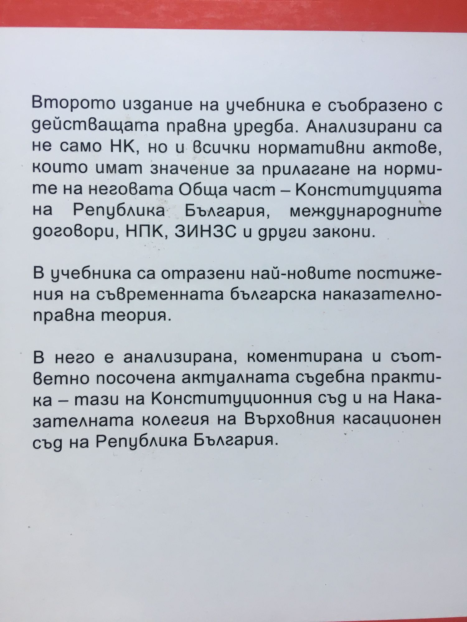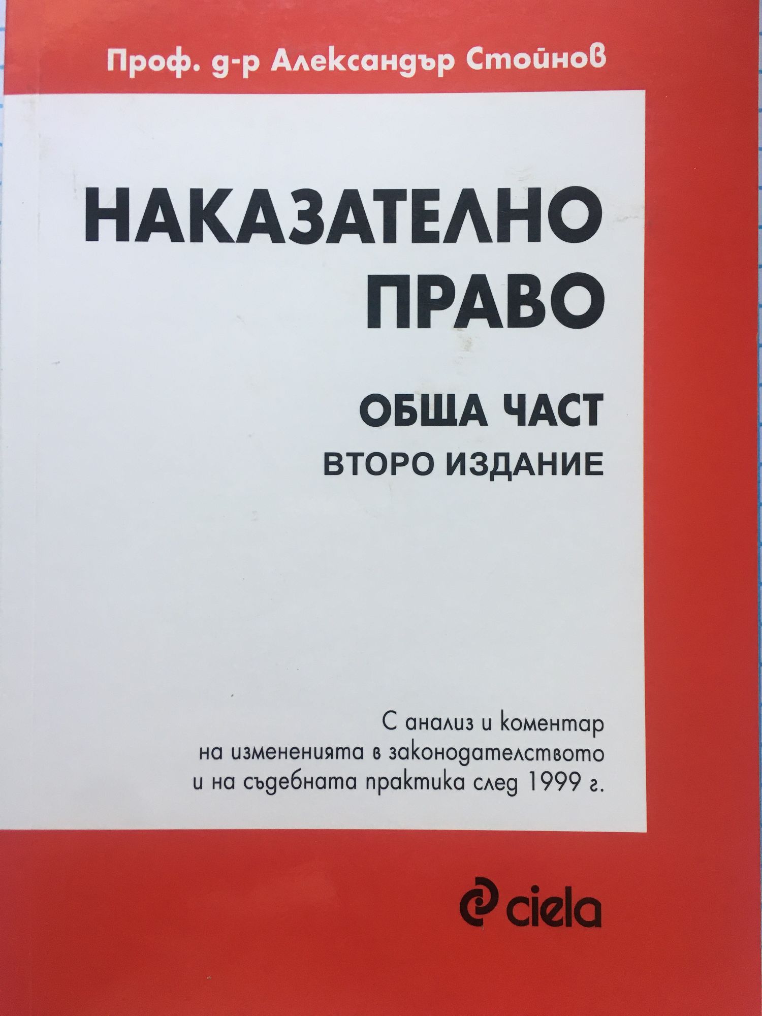 В новото издание са разгледани задълбочено всички институти от Общата част на Наказателния кодекс. Освен това са анализирани и коментирани тенденциите в съдебната практика и тълкувателните решения на Върховния касационен съд. проф. д-р Александър Стойнов е роден на 8 юни 1949 г. в гр. София. Завършва средно образование през 1968 г. в лицей "Декарт" при Френската културна мисия - гр. Алжир и висше образование през 1974 г. в ЮФ на СУ "Св. Климент Охридски". Започва преподавателска дейност в СУ "Св. Климент Охридски" като асистент по наказателно право през 1977 г., а през 2004 г. получава званието професор. Доктор по право е в същия университет. Специализирал е в Париж, в Института за сравнителноправни изследвания и в Юридическия факултет на Сорбоната по въпросите, свързани с жертвата на престъплението. Наред с това е специализирал и в областта на основните права на човека в Юридическия факултет на Университета в Монпелие, Франция. Носител на почетен знак на СУ "Св. Климент Охридски" с огърлица. Проф. д-р Александър Стойнов е автор на множество монографии, учебници (включително и на брайлови издания), статии и студии на български, руски, френски и немски език. Десетки статии и студии по широк кръг въпроси на наказателното право, включително по проблемите на защита на банковата тайна, за жертвата на престъплението, престъпленията против личността, престъпленията против правата на гражданите, престъпленията против собствеността и т.н.