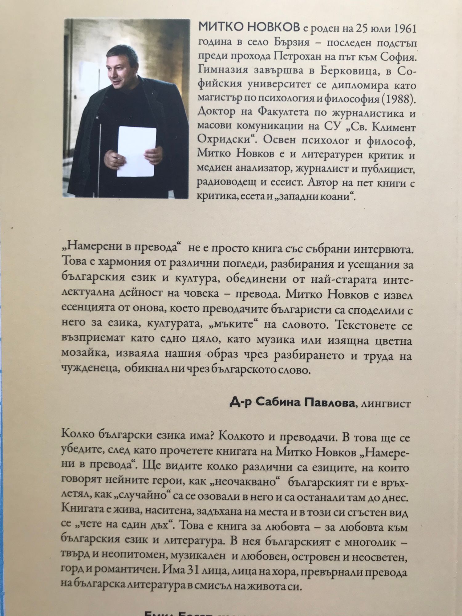 3 х С = С (сбита формула на себеотрицателното състояване на преводите на българска литература зад граница). Това са 31 интервюта с хора от най-различни държави по света, посветили своя живот на българския език, на литературата ни и изобщо на всеотдайната си любов към културните постижения на българския народ. Осъществени са в периода февруари 2011 – декември 2013 по най-различни начини – лични срещи, готови въпроси (в действителност само едно, с Димитрис Аллос от Гърция), фейсбук-чат или електронни писма. Всички отговорили се отзоваха с желание, което показва колко много се надяват те ние тук, в България, да им обърнем внимание, да оценим усилията им, да ги подпомогнем дори. И то не единствено на личностно или на творческо ниво, а и на институционално. А парадоксът, който се яви след разговорите, показа точно това: на институционално ниво тези хора са оставени сами на себе си, сами да се грижат – едва ли не като литературни агенти (професия, доста скъпо платена в западните държави), за разпространението и популяризирането на българската литература в техните страни. Като едни го вършат с голям успех, но някои вече са вдигнали ръце от българското институционално безразличие и се занимават с други дела. Отрадното все пак е, че отново и отново се намират млади хора, които по една или по друга причина се обръщат с ведро лице към българската култура и литература, към България и им засвидетелстват любов, преданост, самоотверженост, въодушевеност, ентусиазъм... Всъщност, три думи, започващи с буквата С, стоят в основата на решението на тези хора да посветят живота си на българските култура, писменост и език: Случайност, Себеотрицателност, Стоицизъм. Събрани в едно, умножени по три, тези три думички се изливат и сглобяват в една-единствена, която може би е най-важната, но и най-взискателната, ала не към тях, българистите-чужденци, а към нас, българите-местници. И тази дума е Съдба. 3 х С (Случайност, Себеотрицание, Стоицизъм) = С (Съдба) – ето я простичката формула да си преводач от български. Българският за всекиго от тях е съдба и на тази своя съдба те се радват и са ѝ благодарни. Въпреки трудностите, въпреки неразбирането, въпреки на моменти кощунствените по отношение на енергията им действия на българските власти (особено по съветско време, когато номенклатурните комунистически кадри са искали всичко да контролират, макар и днешното да не му отстъпва, но в друга посока – пълна държавна незаинтересованост и безхаберие) и на културните чиновници, гледащи на българистите като на някакви чудати смешници... Въпреки че, честно казано, ако от време на време се чува нещичко за българската литература по света, дължим го на тях, на техните индивидуални търчаници и напрежения, не на промислена българска държавна политика, каквато, за съжаление, няма и изобщо не е ясно дали някога все пак ще има. Но нека изоставим държавата на нейните безидейни чиновници, да видим културата и нейните идейни преводачи... "Намерени в превода" не е просто книга със събрани интервюта. Това е хармония от различни погледи, разбирания и усещания за българския език и култура, обединени от най-старата интелектуална дейност на човека - превода. Митко Новков е извел есенцията от онова, което преводачите българисти са споделили с него за езика, културата, "мъките" на словото. Текстовете се възприемат ка