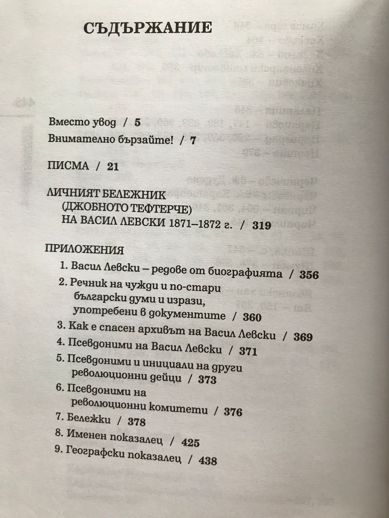 ВМЕСТО УВОД От последното (което е и най-пълно) издание на документалното наследство на Васил Левски изминаха почти три десетилетия (Васил Левски. Документално наследство. Юбилейно издание по случай 100 години от гибелта му. Подготвили за печат: Кирила Възвъзова-Каратеодорова, Здравка Нонева, Виктория Тилева, Николай Генчев. Редактирали: К. Възвъзова-Каратеодорова и Н. Генчев. С, 1973.). След неговата поява на бял свят интересът към писмата и други документи на Апостола не престанаха. В различни списания и вестници се появиха съобщения за нови негови писма и др. По инициатива на Общобългарския комитет "Васил Левски" преди две години бе издаден внушителен том с факсимилета на документалното богатство (Васил Левски. Документи в 2 тома. Съставители: Крумка Шарова и др. Т. I. Факсимилно издание на документите. С, 2000.), с намерение да последва и друг. Но по причини, неизвестни нам, осъществяването на тази задача остава нереализирана и досега. Затова за нас като най-пълно и точно издание на ръкописното наследство си остава изданието от 1973 г. Да се обърнем към него ни подтикна още едно съображение: в това издание е направен и сполучлив опит за осъвременяване на езика на Апостола, което го прави разбираем не само за специалистите, но и за по-широк кръг читателска аудитория. На вниманието на читателите предоставяме писмата на В. Левски, както и неговия личен бележник (джобното тефтерче), като изоставяме кратките анотации към всяко едно от писмата и последвалите под всяко едно от тях искови данни и обяснителни записки. Вместо това си позволяваме да дадем в края на тома по-подробни обяснителни бележки за споменатите в документа лица и събития, както и в отделни приложения псевдонимите на Апостола, на другите революционни дейци и комитети. Специално за подрастващите включваме и спомените на Никола Цветков, който е съхранил личния архив на В. Левски буквално в самото навечерие, преди да бъде заловен от османските власти в Къкринското ханче в края на декември 1872 г. Разказът на Н. Цветков е кратък, но изключително важен, за да остане в съзнанието на всички българи при какви обстоятелства е оцелял този архив. Пак с оглед задачата документалното наследство да бъде ползвано от по-широки кръгове от българското общество поместваме и кратък списък на остарелите и чуждите думи в писмата и другите документи. Накрая, за да улесним читателите в ориентирането на съдържанието на документалното наследство на Апостола, сме изготвили и два показалеца - именен и географски. Надяваме се, че в този вид изданието ще удовлетвори вниманието на всички, които проявяват интерес към оцелелите до нас ръкописи на една от най-титаничните фигури от Възраждането ни. Ст. н. с. МИЛЕН КУМАНОВ