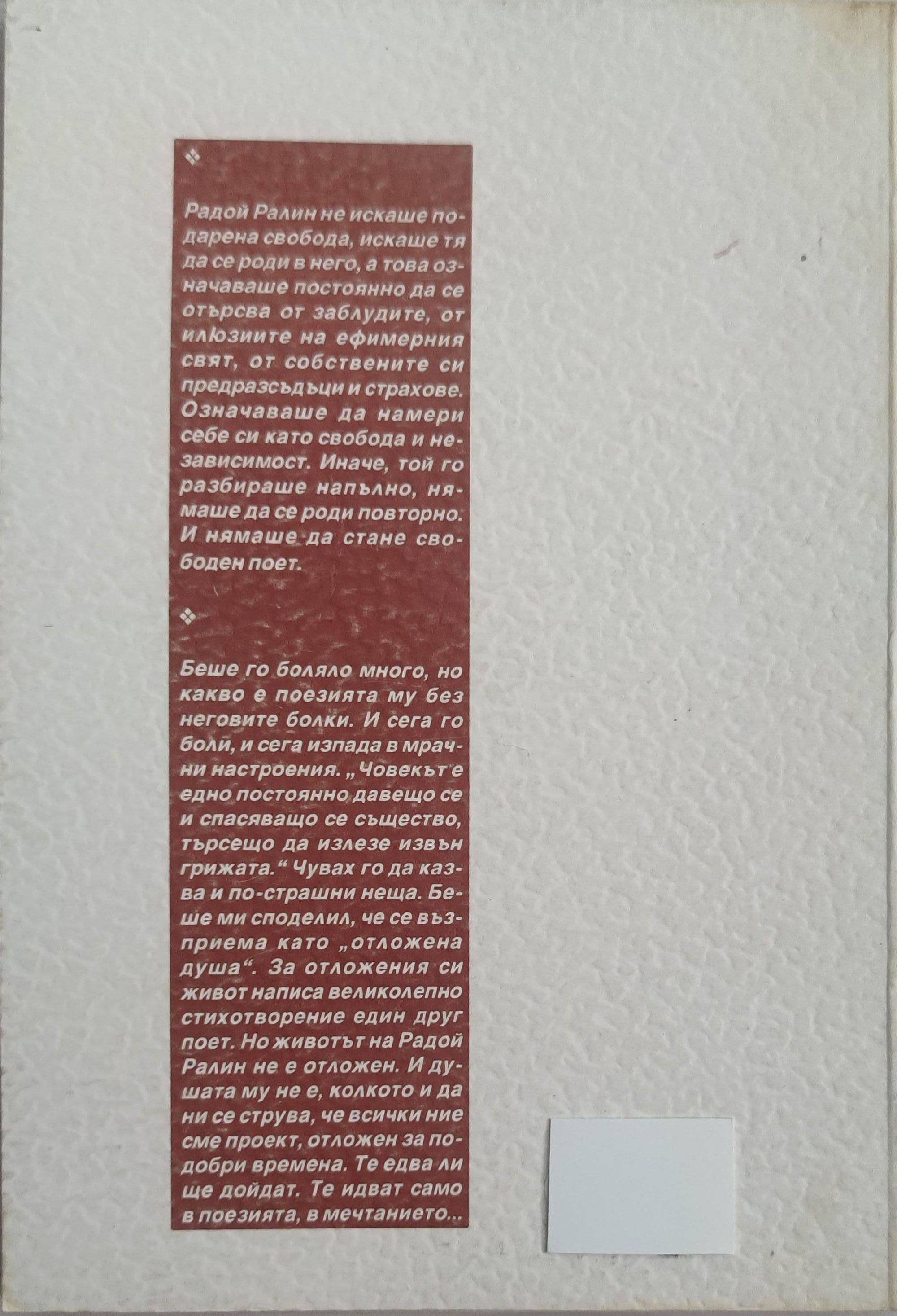 7,67 € / 15,00 лв.Отлично състояние на книжното тяло. С лично посвещение от автора.