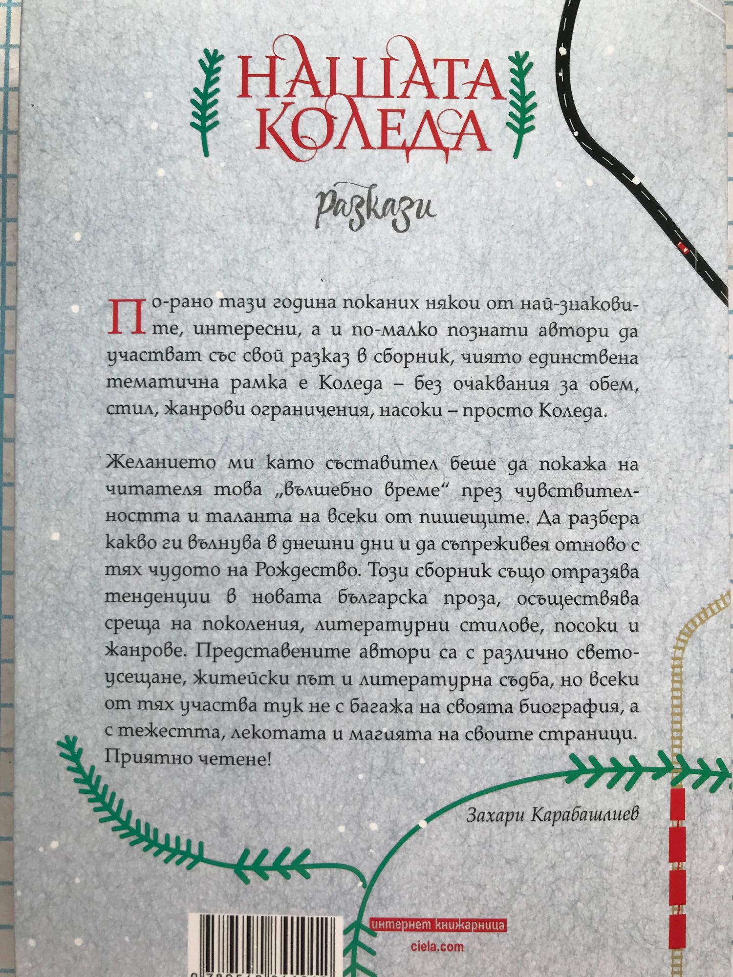 По-рано тази година поканих някои от най-знаковите, интересни, а и по-малко познати автори да участват със свой разказ в сборник, чиято единствена тематична рамка е Коледа – без очаквания за обем, стил, жанрови ограничения, насоки – просто Коледа. Желанието ми като съставител беше да видя това „вълшебно време“ през чувствителността и таланта на всеки от пишещите, да видя какво ги вълнува в днешни дни, а като читател – да съпреживея отново с тях чудото на Рождество. Този сборник също отразява тенденции в новата българска проза, осъществява среща на поколения, литературни стилове, посоки и жанрове. Представените автори са с различно светоусещане, житейски път и литературна съдба, но всеки от тях участва тук не с багажа на своята биография, а с тежестта, лекотата и магията на своите страници. Приятно четене! Захари Карабашлиев