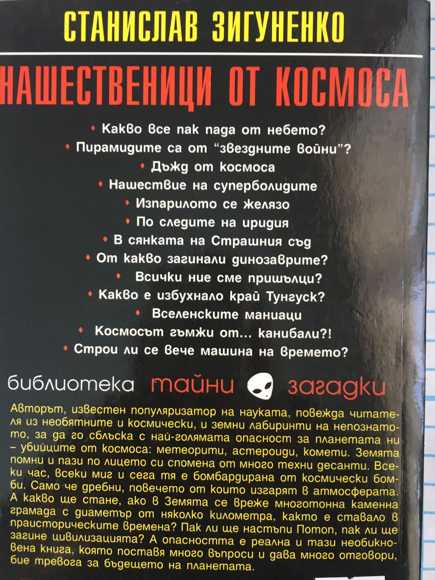 Какво все пак пада от небето? Пирамидите са от "звездните войни"? Дъжд от Космоса Нашествие на суперболидите Изпарилото се желязо По следите на иридия В сянката на Страшния съд От какво са загинали динозаврите? Всички ние сме пришълци? Какво е избухнало край Тунгуск? Вселенските маниаци Космосът гъмжи от... канибали?! Строи ли се вече машина на времето? Авторът, известен популяризатор на науката, повежда читателя из необятните и космически, и земни лабиринти на непознатото, за да го сблъска с най-голямата опасност за планетата ни - убийците от Космоса: метеорити, астероиди, комети. Земята помни и пази по лицето си спомена от много техни десанти. Всеки час, всеки миг и сега тя е бомбардирана от космически бомби. Само че дребни, повечето от които изгарят в атмосферата. А какво ще стане, ако в Земята се вреже многотонна каменна грамада с диаметър от няколко километра, както е ставало в праисторическите времена? Пак ли ще настъпи Потоп, пак ли ще загине цивилизацията? А опасността е реална и тази необикновена книга, която поставя много въпроси и дава много отговори, бие тревога за бъдещето на планетата.