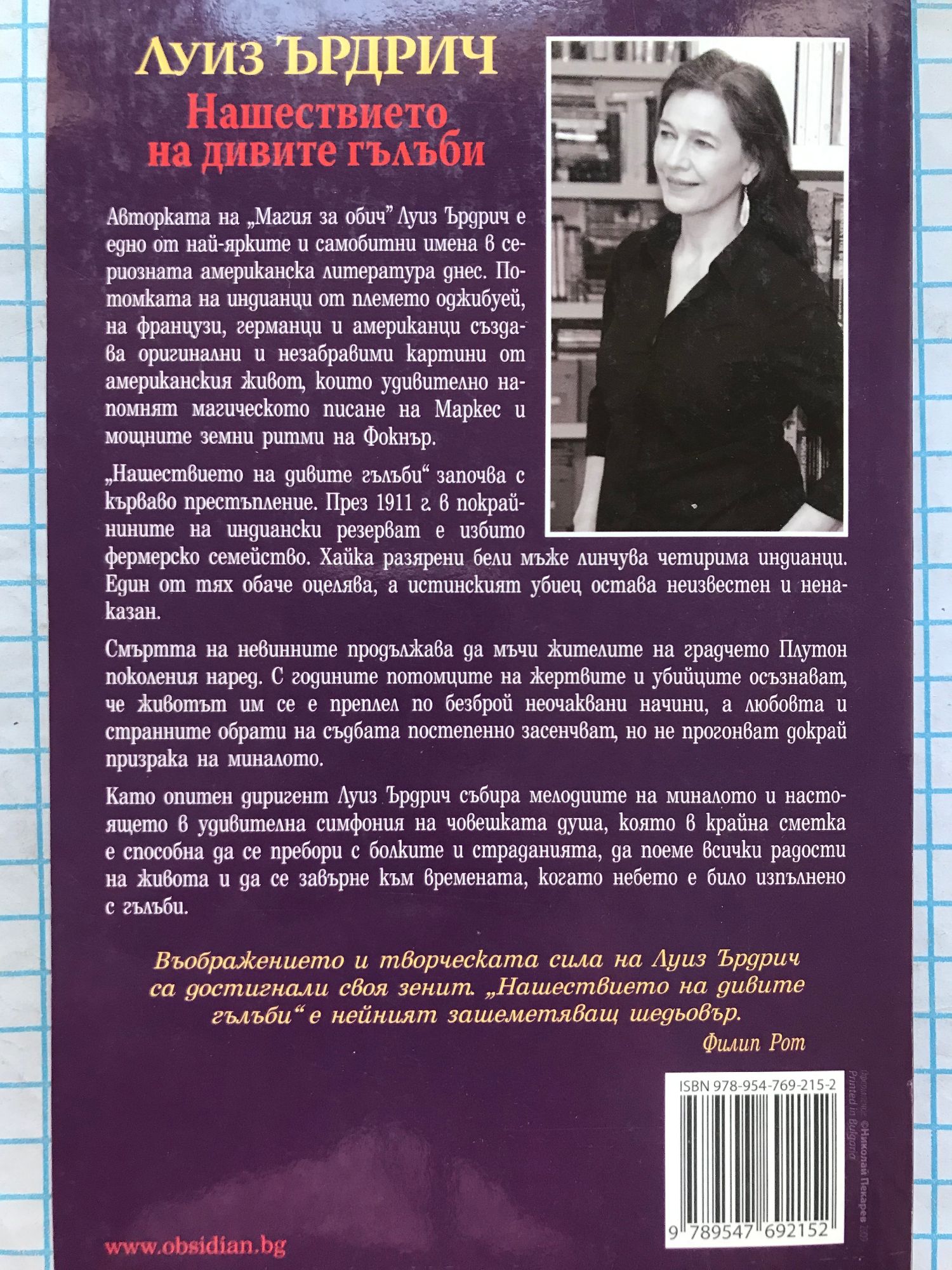 Авторката на „Магия за обич” Луиз Ърдрич е едно от най-ярките и самобитни имена в сериозната американска литература днес. Потомката на индианци от племето оджибуей, на французи, германци и американци създава оригинални и незабравими картини от американския живот, които удивително напомнят магическото писане на Маркес и мощните земни ритми на Фокнър. „Нашествието на дивите гълъби” започва с кърваво престъпление. През 1911 г. в покрайнините на индиански резерват е избито фермерско семейство. Хайка разярени бели мъже линчува четирима индианци. Един от тях обаче оцелява, а истинският убиец остава неизвестен и ненаказан. Смъртта на невинните продължава да мъчи жителите на градчето Плутон поколения наред. С годините потомците на жертвите и убийците осъзнават, че животът им се е преплел по безброй неочаквани начини, а любовта и странните обрати на съдбата постепенно засенчват, но не прогонват докрай призрака на миналото. Като опитен диригент Луиз Ърдрич събира мелодиите на миналото и настоящето в удивителна симфония на човешката душа, която в крайна сметка е способна да се пребори с болките и страданията, да поеме всички радости на живота и да се завърне към времената, когато небето е било изпълнено с гълъби. „Въображението и творческата сила на Луиз Ърдрич са достигнали своя зенит. „Нашествието на дивите гълъби” е нейният зашеметяващ шедьовър.” Филип Рот