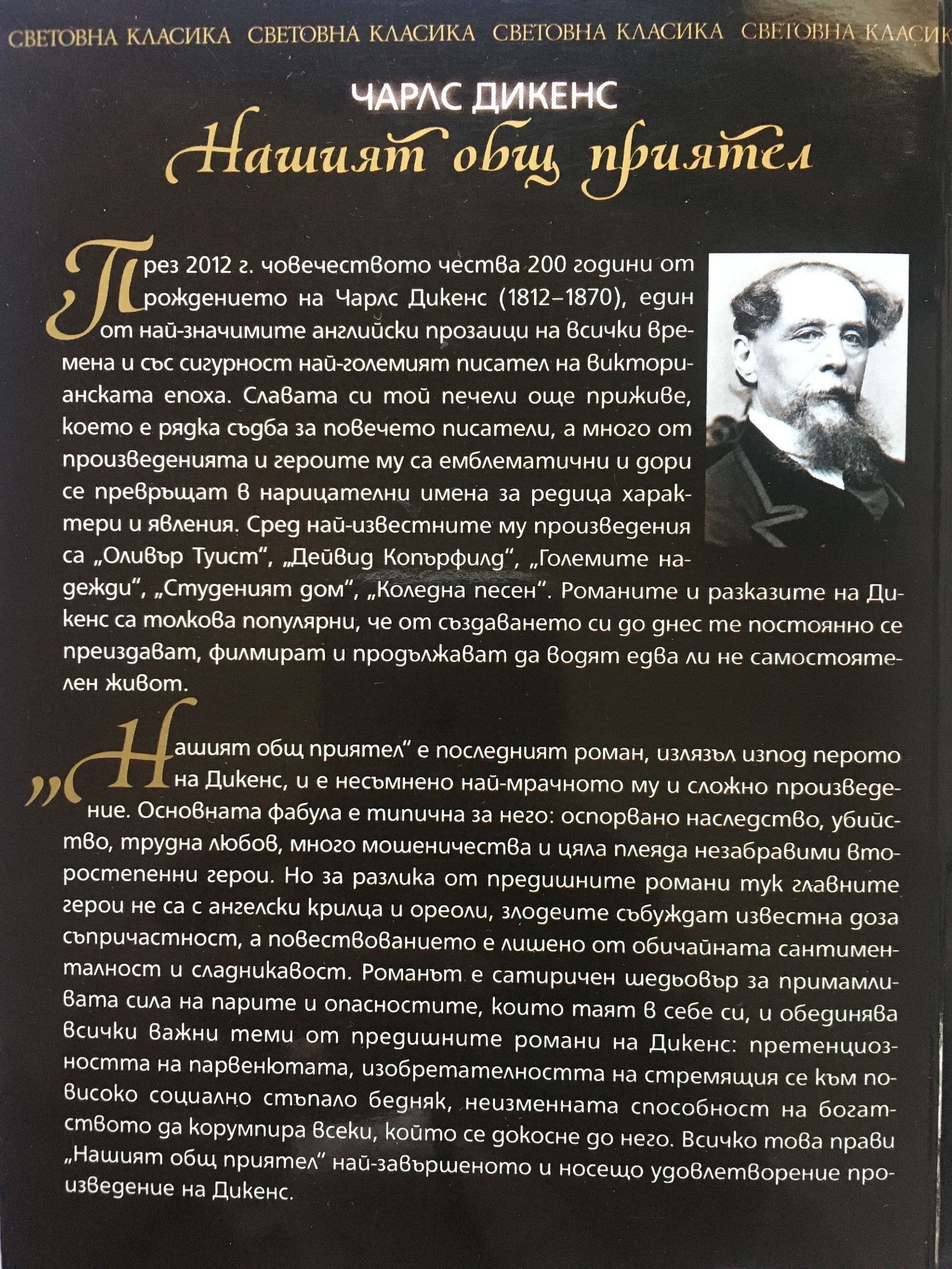 „Нашият общ приятел“ е последният роман, излязъл изпод перото на Дикенс, и е несъмнено най-мрачното му и сложно произведение. Основната фабула е типична за него: оспорвано наследство, убийство, трудна любов, много мошеничества и цяла плеяда незабравими второстепенни герои. Но за разлика от предишните романи тук главните герои не са с ангелски крилца и ореоли, злодеите събуждат известна доза съпричастност, а повествованието е лишено от обичайната сантименталност и сладникавост. Романът е сатиричен шедьовър за примамливата сила на парите и опасностите, които таят в себе си, и обединява всички важни теми от предишните романи на Дикенс: претенциозността на парвенютата, изобретателността на стремящия се към по-високо социално стъпало бедняк, неизменната способност на богатството да корумпира всеки, който се докосне до него. Всичко това прави „Нашият общ приятел“ най-завършеното и носещо удовлетворение произведение на Дикенс.