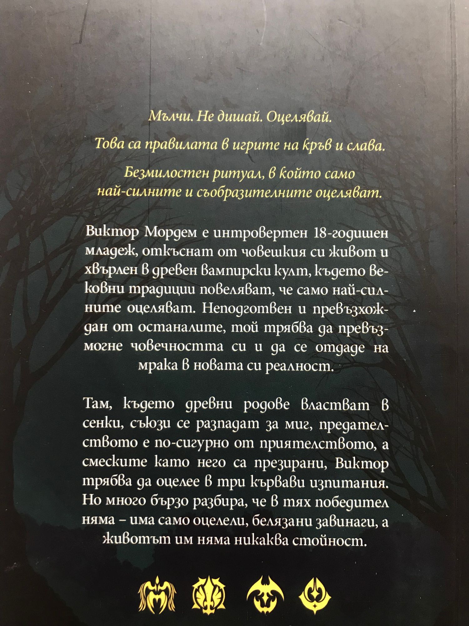 Мълчи. Не дишай. Оцелявай. Това са правилата в игрите на кръв и слава. Безмилостен ритуал, в който само най-силните и съобразителните оцеляват. Виктор Мордем е интровертен 18-годишен младеж, откъснат от човешкия си живот и хвърлен в древен вампирски култ, където вековни традиции повеляват, че само най-силните оцеляват. Неподготвен и превъзхождан от останалите, той трябва да превъзмогне човечността си и да се отдаде на мрака в новата си реалност. Там, където древни родове властват в сенки, съюзи се разпадат за миг, предателството е по-сигурно от приятелството, а смеските като него са презирани, Виктор трябва да оцелее в три кървави изпитания. Но много бързо разбира, че в тях победител няма – има само оцелели, белязани завинаги, а животът им няма никаква стойност.