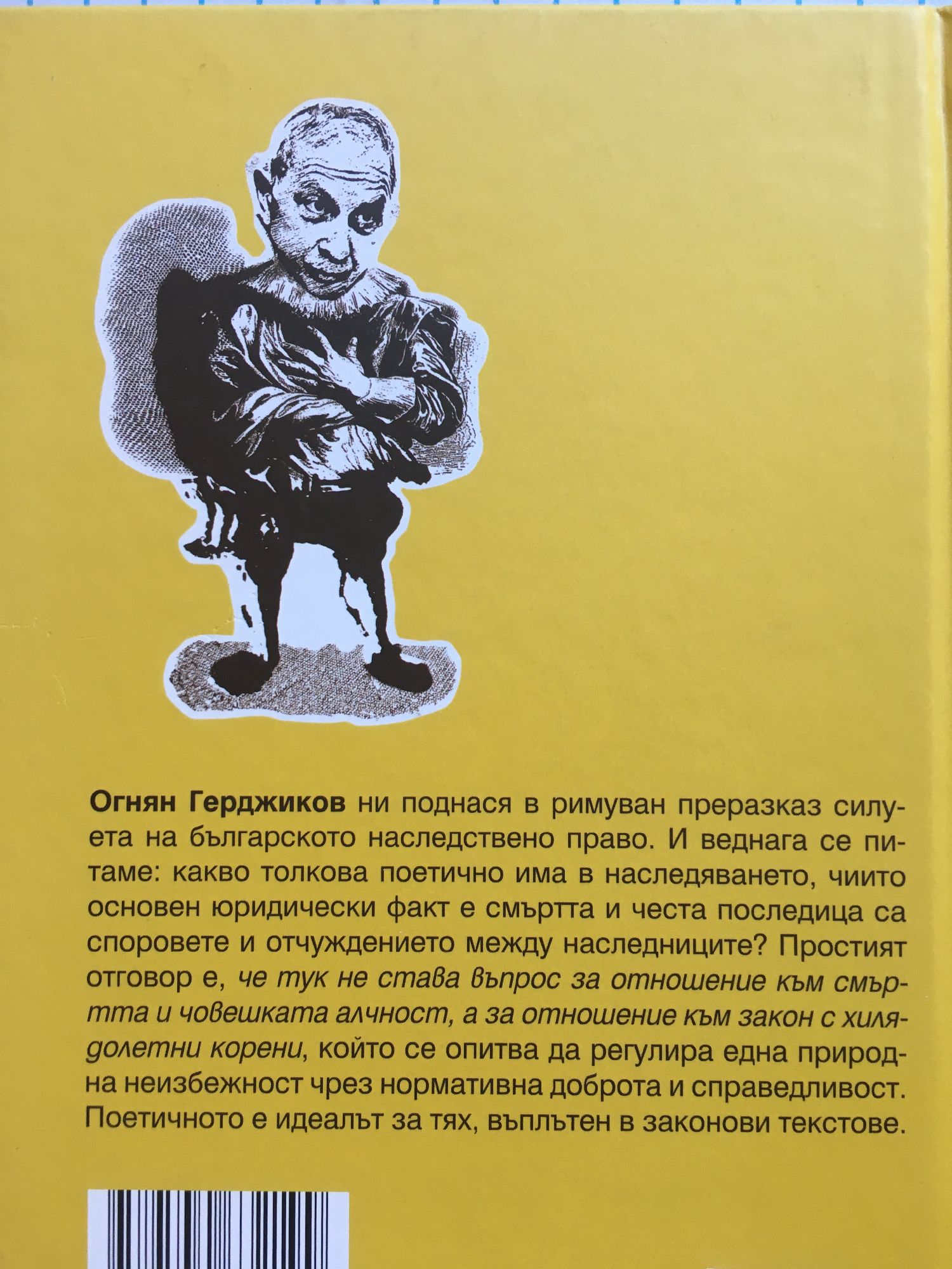 Огнян Герджиков ни поднася в римуван преразказ силуета на българското наследствено право. И веднага се питаме: какво толкова поетично има в наследяването, чиито основен юридически факт е смъртта и честа последица са споровете и отчуждението между наследниците? Простият отговор е, че тук не става въпрос за отношение към смъртта и човешката алчност, а за отношение към закон с хилядолетни корени, който се опитва да регулира една природна неизбежност чрез нормативна доброта и справедливост. Поетичното е идеалът за тях, въплътен в законови текстове.