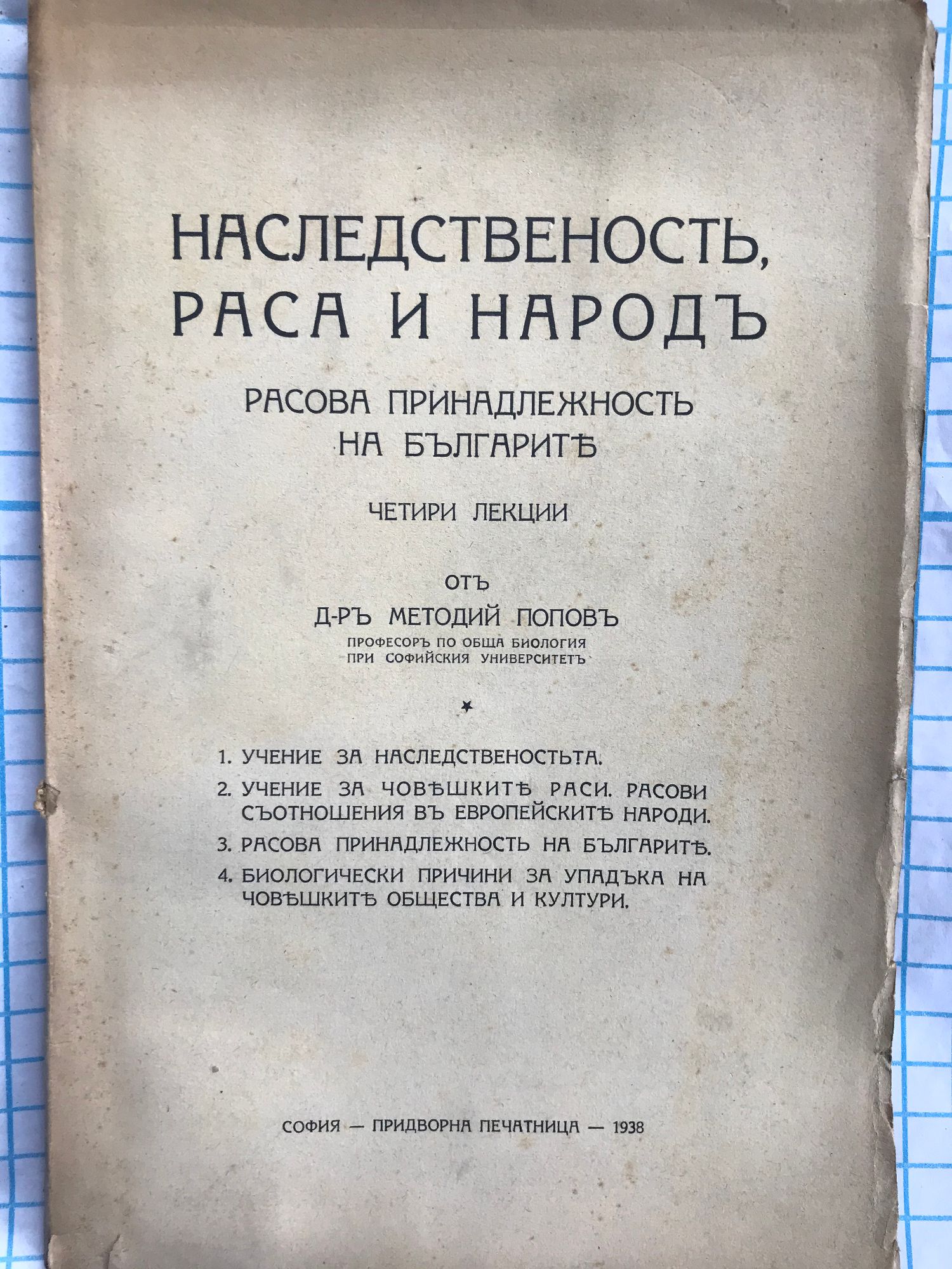 Лекции: 1. Учение за наследствеността. 2. Учение за човешките раси. Расови съотношения в европейските народи. 3. Расова принадлежност на българите. 4. Биологически причини за упадъка на човешките общества и култури.