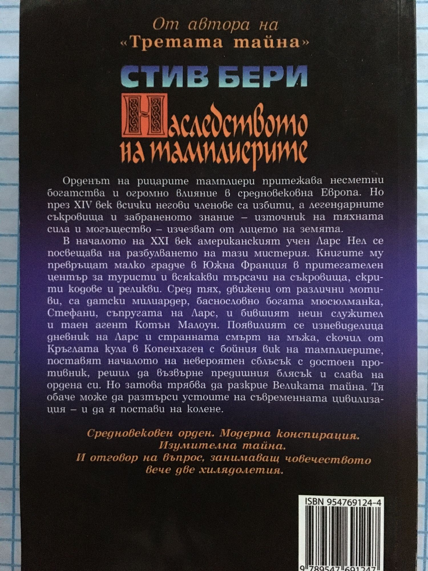 Орденът на рицарите тамплиери притежава несметни богатства и огромно влияние в средновековна Европа. Но през XIV век всички негови членове са избити, а легендарните съкровища и забраненото знание - източници на тяхната сила и могъщество - изчезват от лицето на земята. В началото на XXI век американският учен Ларс Нел се посвещава на разбулването на тази мистерия. Книгите му превръщат малко градче в Южна Франция в притегателен център за туристи и всякакви търсачи на съкровища, скрити кодове и реликви. Сред тях, движени от различни мотиви, са датски милиардер, баснословно богата мюсюлманка, Стефани, съпругата на Ларс, и бившият неин служител и таен агент Котън Малоун. Появилият се изневиделица дневник на Ларс и странната смърт на мъжа, скочил от Кръглата кула в Копенхаген с бойния вик на тамплиерите, поставят началото на невероятен сблъсък с достоен противник, решил да възвърне предишния блясък и слава на ордена си. Но затова трябва да разкрие Великата тайна. Тя обаче може да разтърси устоите на съвременната цивилизация - и да я постави на колене. Средновековен орден. Модерна Конспирация. Изумителна тайна. И отговор на въпрос, занимаващ човечеството вече две хилядолетия.