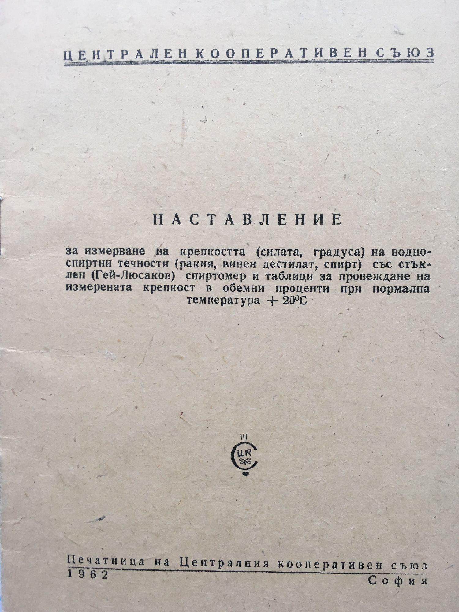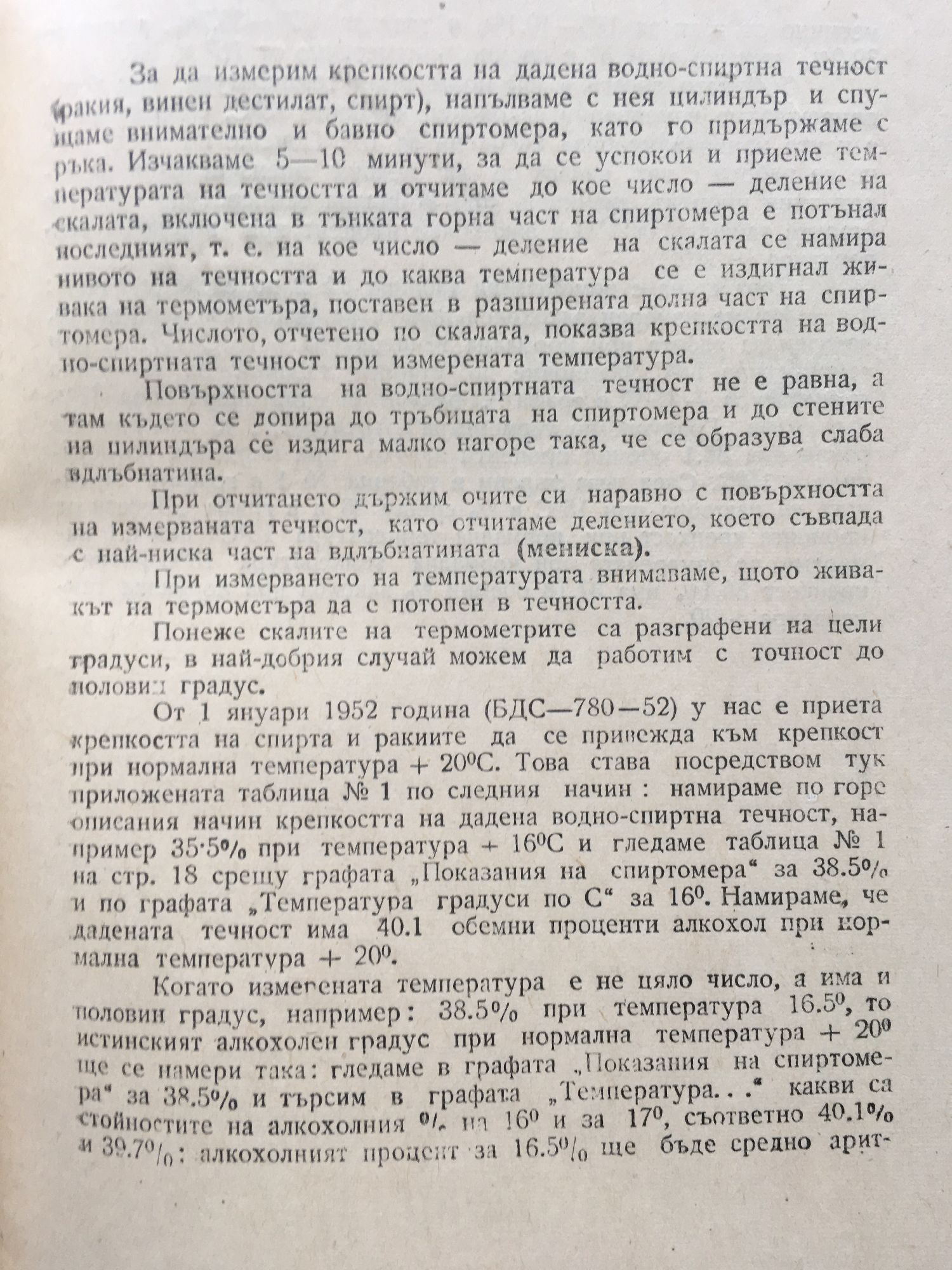 Наставление за измерване на крепкостта (силата, градуса) на водно-спиртни течности (ракия, винен дестилат, спирт) със стъклен (Гей-Люсаков) спиртомер и таблици за провеждане на измерената крепкост в обемни проценти при нормална температура + 20*С
