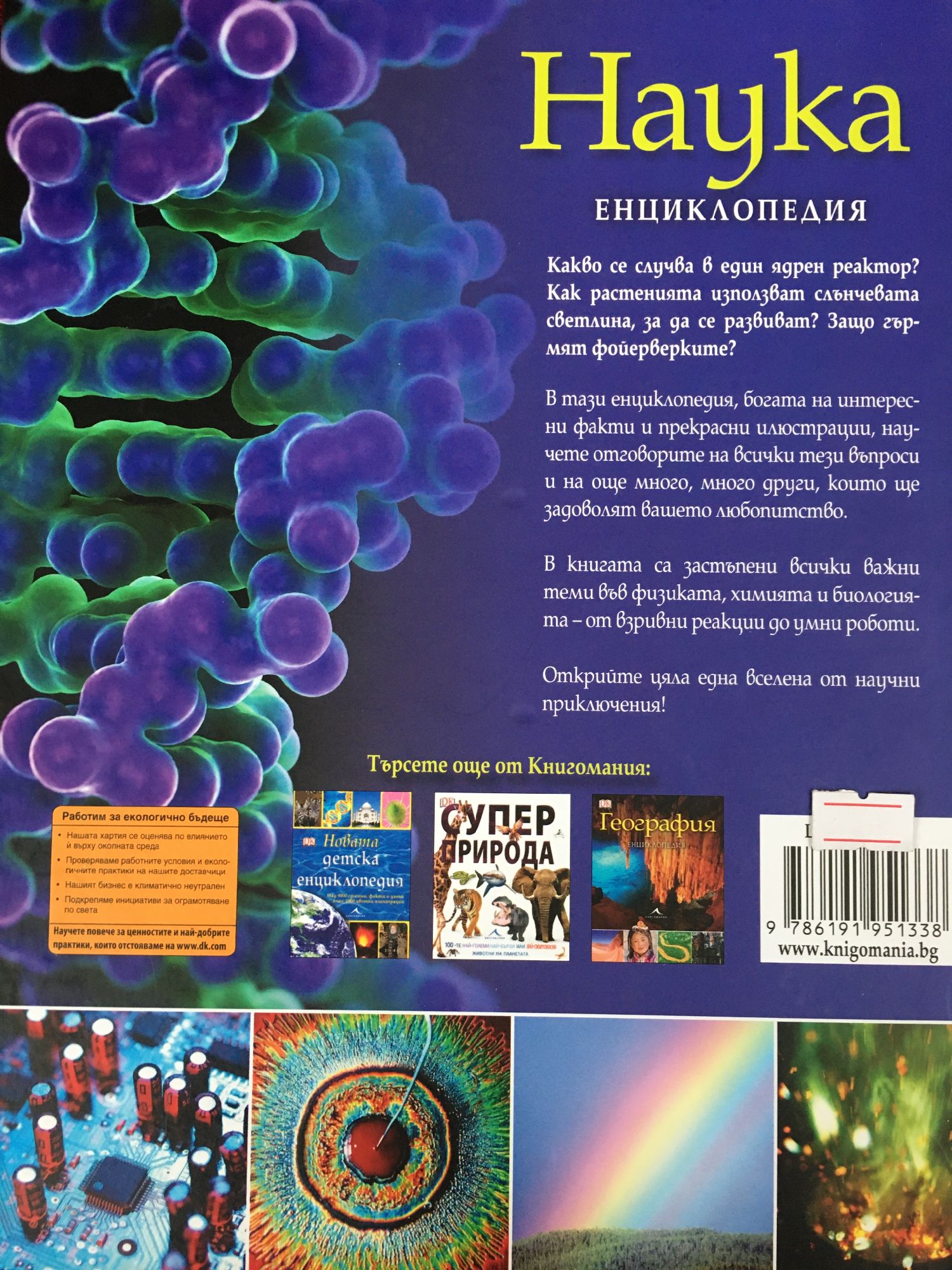 Какво се случва в един ядрен реактор? Как растенията използват слънчевата светлина, за да се развиват? Защо гърмят фойерверките? В тази енциклопедия, богата на интересни факти и прекрасни илюстрации, открийте отговорите на всички тези въпроси и на още много, много други, които ще задоволят вашето любопитство. В книгата са застъпени всички важни теми във физиката, химията и биологията – от взривни реакции до умни роботи. Открийте цяла една вселена от научни приключения!