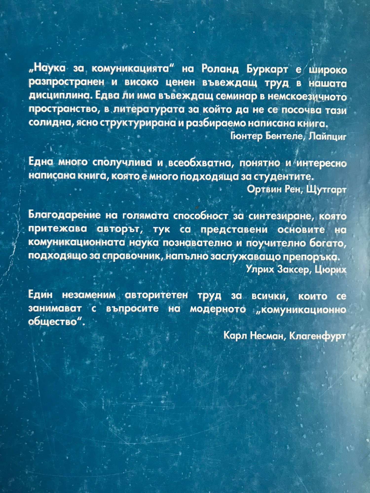 "Наука за комуникацията" на Роланд Буркарт е широко разпространен и високо ценен въвеждащ труд в нашата дисциплина.Едва ли има въвеждащ семинар в немскоезичното пространство,в литературата за които да не се посочва тази солидна,ясноструктурирана и разбираемо написана книга.