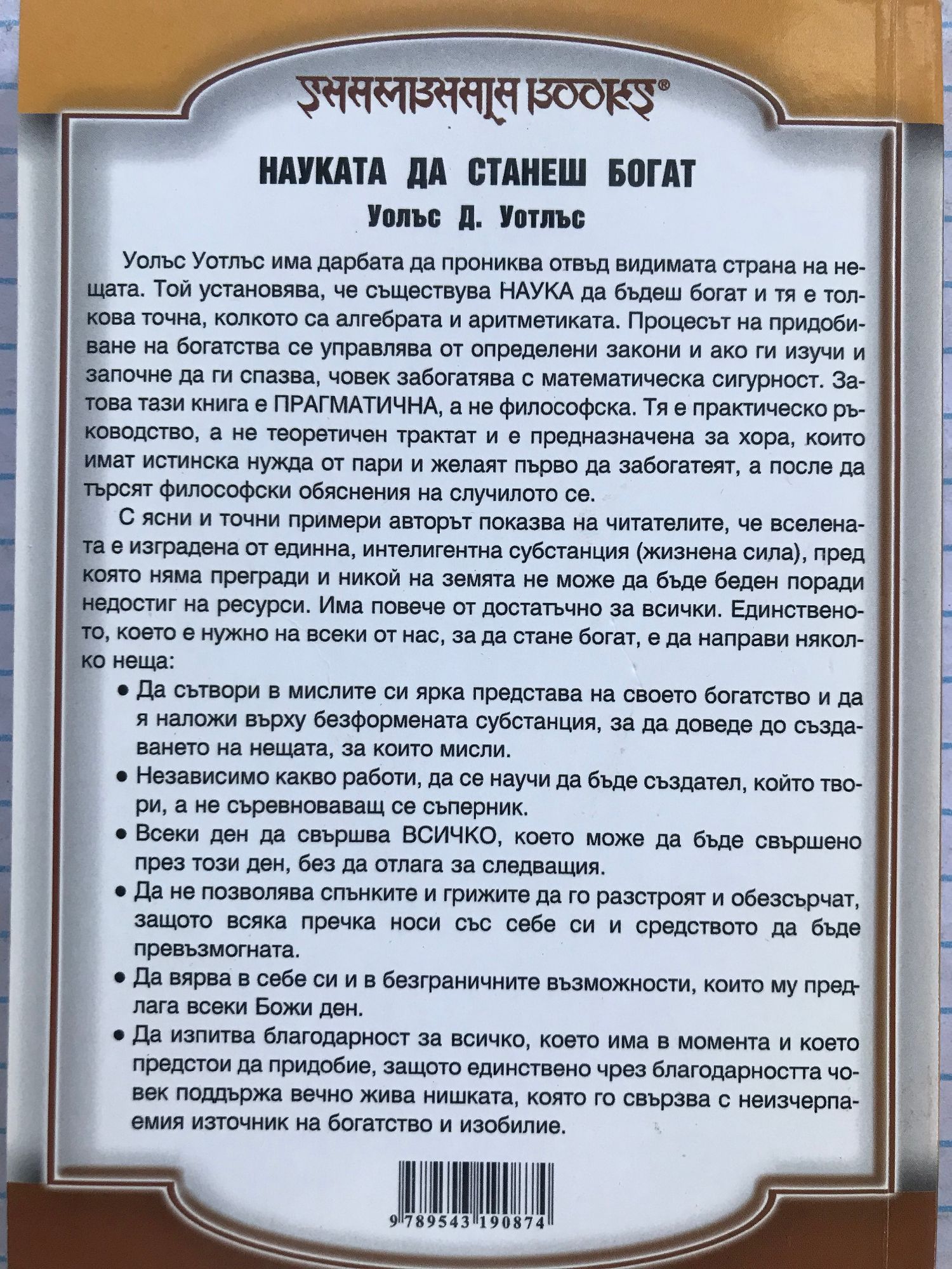 Уолъс Уотлъс има дарбата да прониква отвъд видимата страна на нещата. Той установява, че съществува НАУКА да бъдеш богат и тя е толкова точна, колкото са алгебрата и аритметиката. Процесът на придобиване на богатства се управлява от определени закони и ако ги изучи и започне да ги спазва, човек забогатява с математическа сигурност. Затова тази книга е ПРАГМАТИЧНА, а не философска. Тя е практическо ръководство, а не теоретичен трактат и е предназначена за хора, които имат истинска нужда от пари и желаят първо да забогатеят, а после да търсят философски обяснения на случилото се. С ясни и точни примери авторът показва на читателите, че вселената е изградена от единна, интелигентна субстанция (жизнена сила), пред която няма прегради и никой на земята не може да бъде беден поради недостиг на ресурси. Има повече от достатъчно за всички. Единственото, което е нужно на всеки от нас, за да стане богат, е да направи няколко неща: • Да сътвори в мислите си ярка представа на своето богатство и да я наложи върху безформената субстанция, за да доведе до създаването на нещата, за които мисли. • Независимо какво работи, да се научи да бъде създател, който твори, а не съревноваващ се съперник. • Всеки ден да свършва ВСИЧКО, което може да бъде свършено през този ден, без да отлага за следващия. • Да не позволява спънките и грижите да го разстроят и обезсърчат, защото всяка пречка носи със себе си и средството да бъде превъзмогната. • Да вярва в себе си и в безграничните възможности, които му предлага всеки Божи ден. • Да изпитва благодарност за всичко, което има в момента и което предстои да придобие, защото единствено чрез благодарността човек поддържа вечно жива нишката, която го свързва с неизчерпаемия източник на богатство и изобилие.