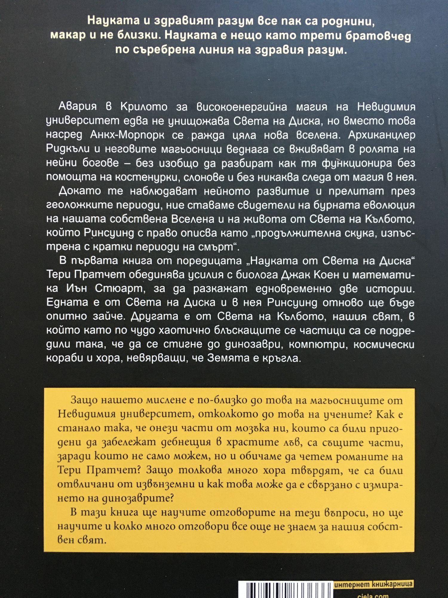 Науката и здравият разум все пак са роднини, макар и не близки. Науката е нещо като трети братовчед по съребрена линия на здравия разум. Авария в Крилото за високоенергийна магия на Невидимия университет едва не унищожава Света на Диска, но вместо това насред Анкх-Морпорк се ражда цяла нова вселена. Архиканцлер Ридкъли и неговите магьосници веднага се вживяват в ролята на нейни богове - без изобщо да разбират как тя функционира без помощта на костенурки, слонове и без никаква следа от магия в нея. Докато те наблюдават нейното развитие и прелитат през геоложките периоди, ние ставаме свидетели на бурната еволюция на нашата собствена Вселена и на живота от Света на Кълбото, който Ринсуинд с право описва като "продължителна скука, изпъстрена с кратки периоди на смърт". В първата книга от поредицата Науката от Света на Диска Тери Пратчет обединява усилия с биолога Джак Коен и математика Иън Стюарт, за да разкажат едновременно две истории. Едната е от Света на Диска и в нея Ринсуинд отново ще бъде опитно зайче. Другата е от Света на Кълбото, нашия свят, в който като по чудо хаотично блъскащите се частици са се подредили така, че да се стигне до динозаври, компютри, космически кораби и хора, невярващи, че Земята е кръгла. Защо нашето мислене е по-близко до това на магьосниците от Невидимия университет, отколкото до това на учените? Как е станало така, че онези части от мозъка ни, които са били пригодени да забележат дебнещия в храстите лъв, са същите части, заради които не само можем, но и обичаме да четем романите на Тери Пратчет? Защо толкова много хора твърдят, че са били отвличани от извънземни и как това може да е свързано с измирането на динозаврите? В тази книга ще научите отговорите на тези въпроси, но ще научите и колко много отговори все още не знаем за нашия собствен свят.