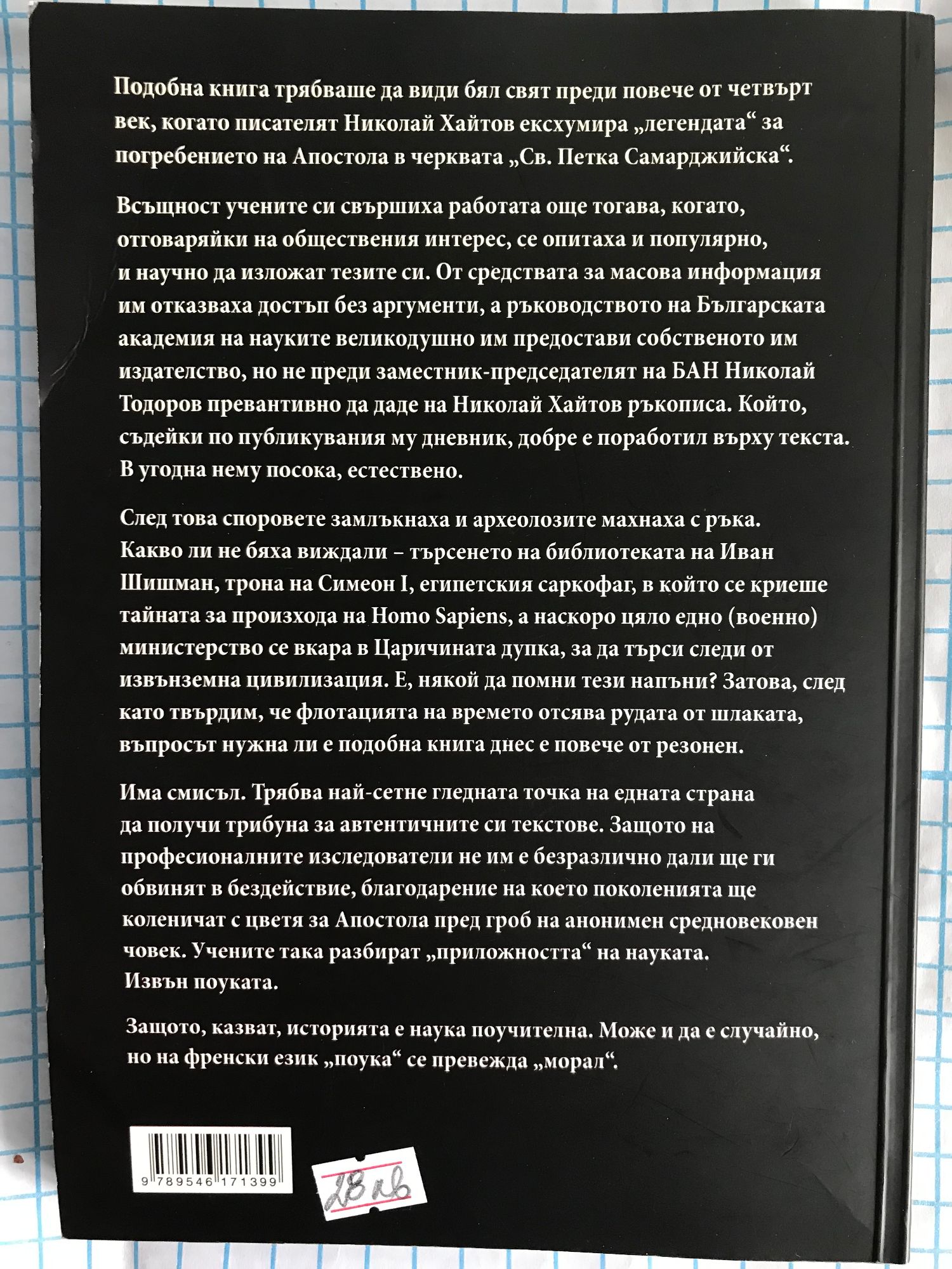Подобна книга трябваше да види бял свят преди повече от четвърт век, когато писателят Николай Хайтов ексхумира "легендата" за погребението на Апостола в черквата "Св. Петка Самарджийска". Всъщност учените си свършиха работата още тогава, когато, отговаряйки на обществения интерес, се опитаха и популярно и научно да изложат тезите си. От средствата за масова информация им отказваха достъп без аргументи. След това споровете замлъкнаха и археолозите махнаха с ръка. Най-сетне гледната точка на едната страна получава трибуна за автентичните си текстове. Защото на професионалните изследователи не им е безразлично дали ще ги обвинята в бездействие, благодарение на което поколенията ще коленичат с цветя за Апостола пред гроб на анонимен средновековен човек. Учените така разбират "приложността" на науката. Предлаганата на читателите книга в две части се явява необходима и полезна. В първата от тях се проследяват историята и развитието на цялата полемика в полза на научната истина, начините и средствата, при които беше водена и които не бяха в нейна полза. Втората част на книгата може определено да се възприема като основна, тъя като в нея по възможно най-достъпен начин се излагат решителните аргументи и данни, значителна част от които са съвършено нови, за невъзможността гробът на апостола да бъде идентифициран в "Св. Петка Самарджийска" - аргументи и данни, които в хода на дискусията бяха пренебрегвани или съзнателно замъглявани от опонентите на историкоархеологическата наука. Авторите се надяват, че техните разсъждения ще бъдат правилно разбрани от широката общественост и ще спомогнат да бъде сложен край на един скандален спор. Защото гробът на великия син на България Васил Левски действително би могъл да бъде свято и свещено място за преклонение от всеки, който обича родината ни. Но истинско, а не измислено и фалшиво място, с което неговият велик дух би бил оскърбен.