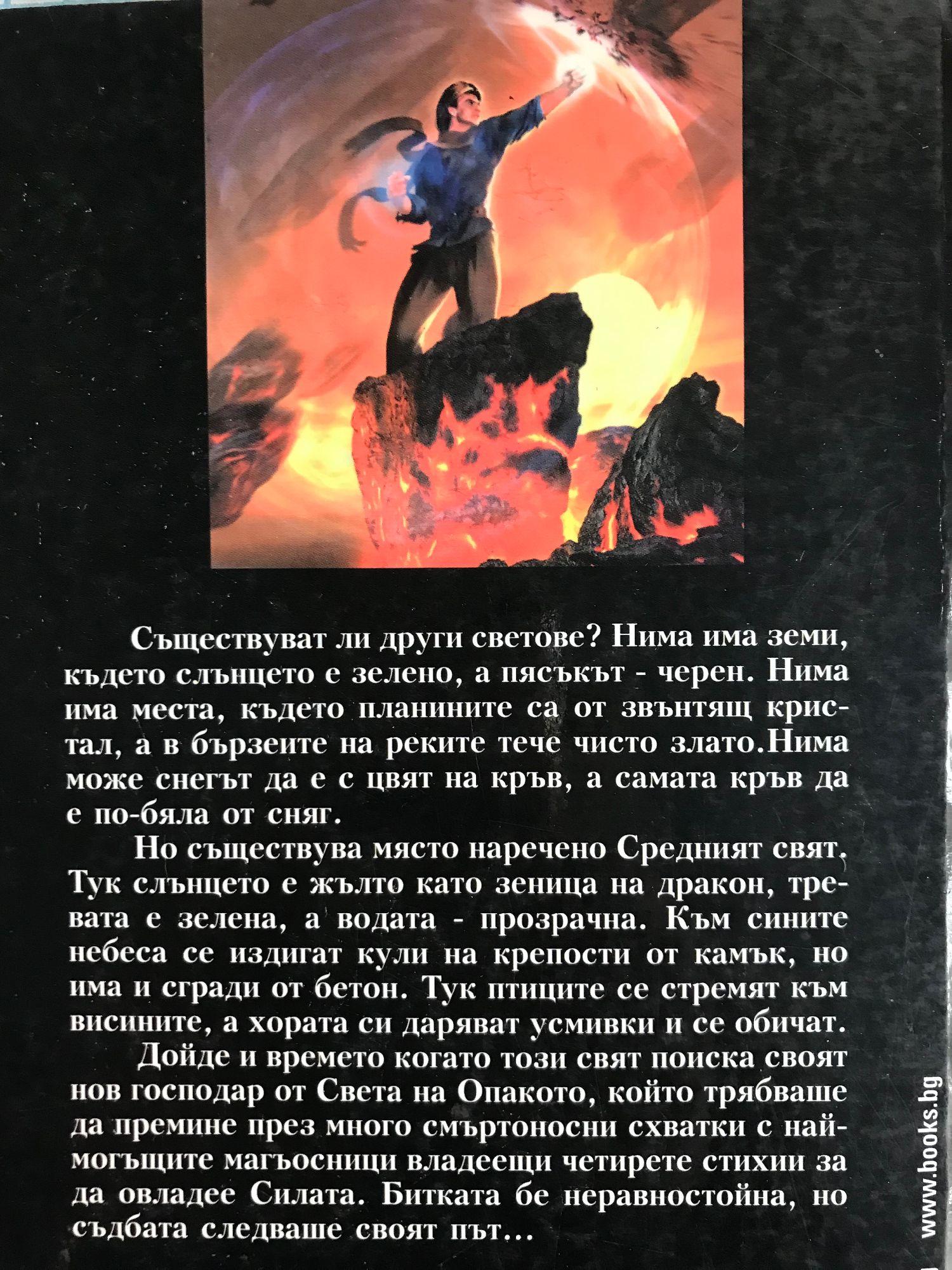 Съществуват ли други светове? Нима има земи, където слънцето е зелено, а пясъкът - черен. Нима има места, където планините са от звънтящ кристал, а в бързеите на реките тече чисто злато. Нима може снегът да е с цвят на кръв, а самата кръв да е по-бяла от сняг. Но съществува място наречено Средният свят. Тук слънцето е жълто като зеница на дракон, тревата е зелена, а водата - прозрачна. Към сините небеса се издигат кули на крепости от камък, но има и сгради от бетон. Тук птиците се стремят към висините, а хората си даряват усмивки и се обичат. Дойде и времето когато този свят поиска своят нов господар от Света на Опакото, който трябваше да премине през много смъртоносни схватки с най-могъщите магъосници владеещи четирите стихии за да овладее Силата. Битката бе неравностойна, но съдбата следваше своят път...