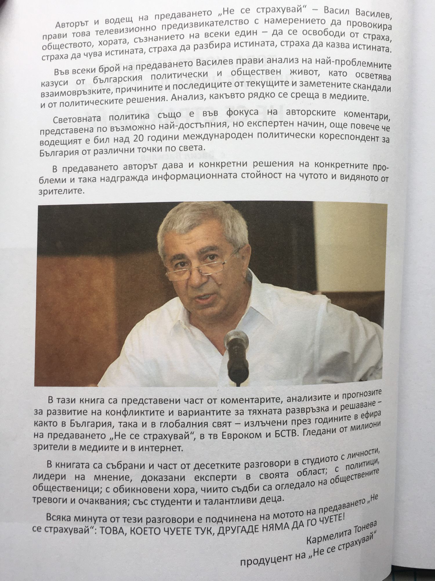 Авторът и водещ на предаването "Не се страхувай " - Васил Василев, прави това телевизионно предизвикателство с намерението да провокира обществото, хората, съзнанието на всеки един - да се освободи от страха, страха да чува истината, страха да разбира истината, страха да казва истината. В тази книга са представени част от коментарите, анализите и прогнозите за развитие на конфликтите и вариантите за тяхната развръзка и решаване - както в България, така и в глобалния свят - излъчени през годините в ефира на предаването "Не се страхувай" в Евроком и БСТВ. Гледани от милиони зрители в медиите и в интернет. В книгата са събрани и част от десетките разговори в студиото с личности, лидери на мнение, доказани експерти в своята област, с политици, общественици, с обикновени хора, чиито съдби са огледало на обществените тревоги и очаквания, със студенти и талантливи деца.