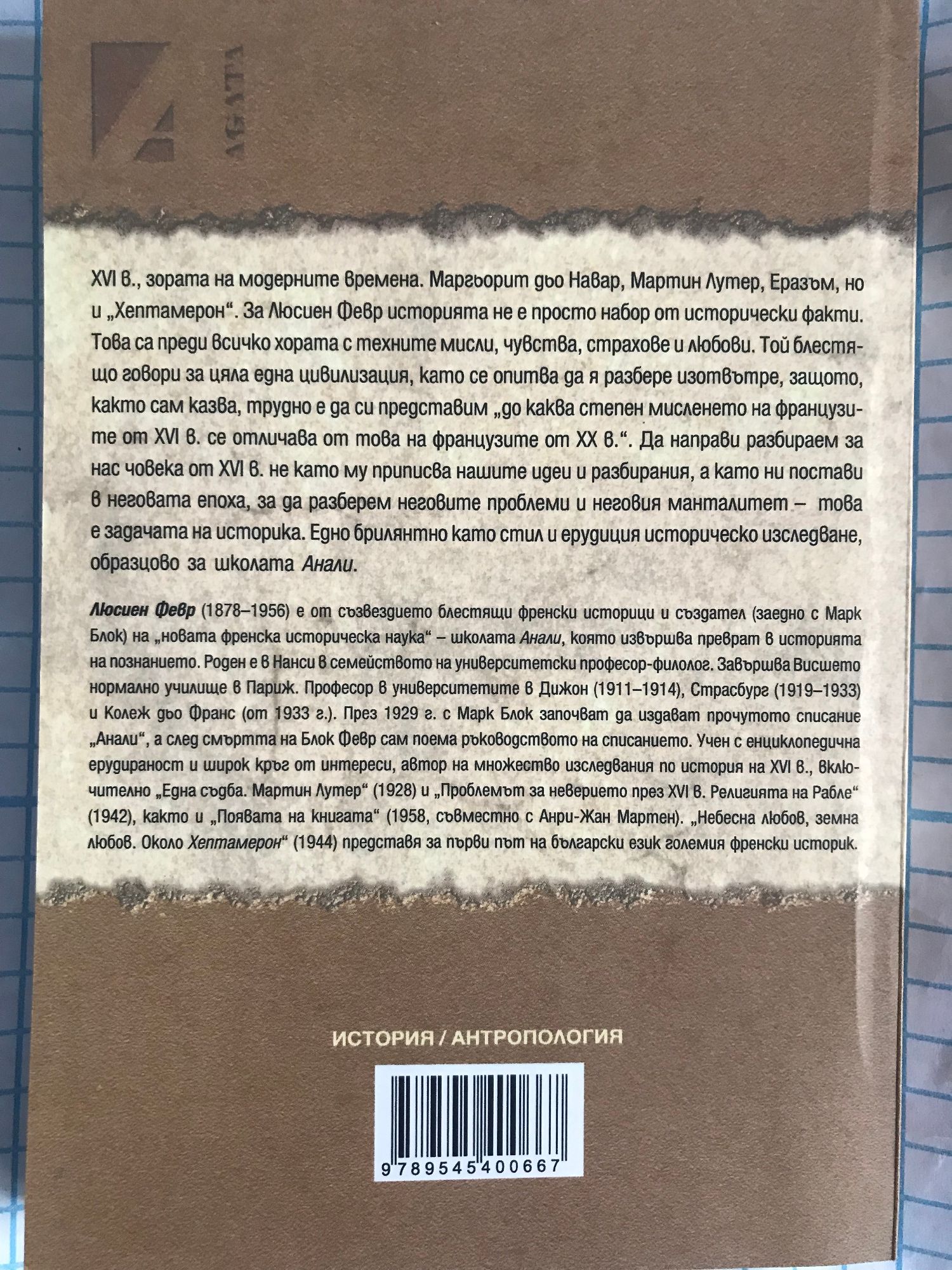 XVI в., зората на модерните времена. Маргьорит дьо Навар, Мартин Лутер, Еразъм, но и „Хептамерон". За Люсиен Февр историята не е просто набор от исторически факти. Това са преди всичко хората с техните мисли, чувства, страхове и любови. Той блестящо говори за цяла една цивилизация, като се опитва да я разбере изотвътре, защото, както сам казва, трудно е да си представим „до каква степен мисленето на французите от XVI в. се отличава от това на французите от XX в.". Да направи разбираем за нас човека от XVI в. не като му приписва нашите идеи и разбирания, а като ни постави в неговата епоха, за да разберем неговите проблеми и неговия манталитет - това е задачата на историка. Едно брилянтно като стил и ерудиция историческо изследване, образцово за школата Анали. Люсиен Февр (1878-1956) е от съзвездието блестящи френски историци и създател (заедно с Марк Блок) на „новата френска историческа наука" - школата Анали, която извършва преврат в историята на познанието. Роден е в Нанси в семейството на университетски професор-филолог. Завършва висшето нормално училище в Париж. Професор в университетите в Дижон (1911-1914), Страсбург (1919-1933) и Колеж дьо Франс (от 1933 г.). През 1929 г. с Марк Блок започват да издават прочутото списание „Анали", а след смъртта на Блок Февр сам поема ръководството на списанието. Учен с енциклопедична ерудираност и широк кръг от интереси, автор на множество изследвания по история на XVI в., включително „Една съдба. Мартин Лутер" (1928) и „Проблемът за неверието през XVI в. Религията на Рабле" (1942), както и появата на книгата (1958, съвместно с Анри-Жан Мартен). „Небесна любов, земна любов. Около Хептамерон" (1944) представя за първи път на български език големия френски историк.