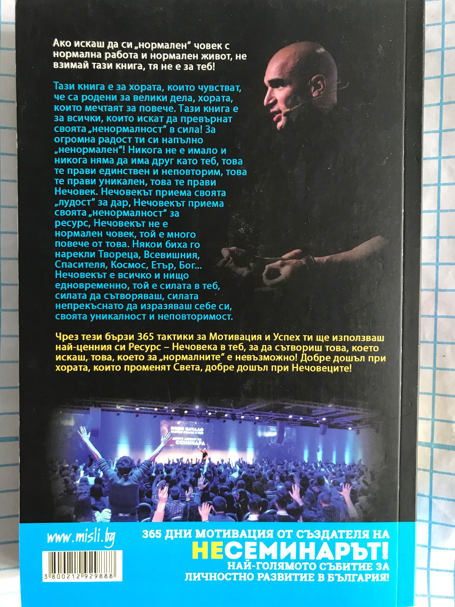 Ако искаш да си "нормален" човек с нормална работа и нормален живот, не взимай тази книга, тя не е за теб! Тази книга е за хората, които чувстват, че са родени за велики дела, хората, които мечтаят за повече. Тази книга е за всички, които искат да превърнат своята "ненормалност" в сила! За огромна радост ти си напълно "ненормален"! Никога не е имало и никога няма да има друг като теб, това те прави единствен и неповторим, това те прави уникален, това те прави Нечовек. Нечовекът приема своята "лудост" за дар, Нечовекът приема своята "ненормалност" за ресурс, Нечовекът не е нормален човек, той е много повече от това. Някои биха го нарекли Твореца, Всевишния, Спасителя, Космос, Етър, Бог... Нечовекът е всичко и нищо едновременно, той е силата в теб, силата да сътворяваш, силата непрекъснато да изразяваш себе си, своята уникалност и неповторимост. Чрез тези бързи 365 тактики за Мотивация и Успех ти ще използваш най-ценния си Ресурс - Нечовека в теб, за да сътвориш това, което искаш, това, което за "нормалните" е невъзможно! Добре дошъл при хората, които променят Света, добре дошъл при Нечовеците!