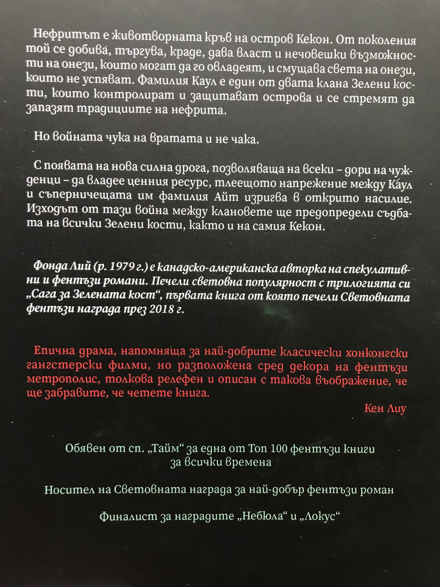Нефритът е животворната кръв на остров Кекон. От поколения той се добива, търгува, краде, дава власт и нечовешки възможности на онези, които могат да го овладеят, и смущава света на онези, които не успяват. Фамилия Каул е един от двата клана Зелени кости, които контролират и защитават острова, и се стремят да запазят традициите на нефрита. Но войната чука на вратата и не чака.. С появата на нова силна дрога, позволяваща на всеки – дори на чужденци – да владее ценния ресурс, тлеещото напрежение между Каул и съперничещата им фамилия Айт изригва в открито насилие. Изходът от тази война между клановете ще предопредели съдбата на всички Зелени кости, както и на самия Кекон. „Епична драма, напомняща за най-добрите класически хонконгски гангстерски филми, но разположена сред декора на фентъзи метрополис, толкова релефен и описан с такова въображение, че ще забравите, че четете книга“ Кен Лиу „Прецизният начин, по който Лий изгражда света си, качва залозите на реалистичните ? и напрегнати екшън сцени.“ Скот Линч * Обявен от сп. „Тайм“ за една от Топ 100 фентъзи книги за всички времена * Носител на Световната награда за най-добър фентъзи роман *Финалист за наградите „Небюла“ и „Локус“э