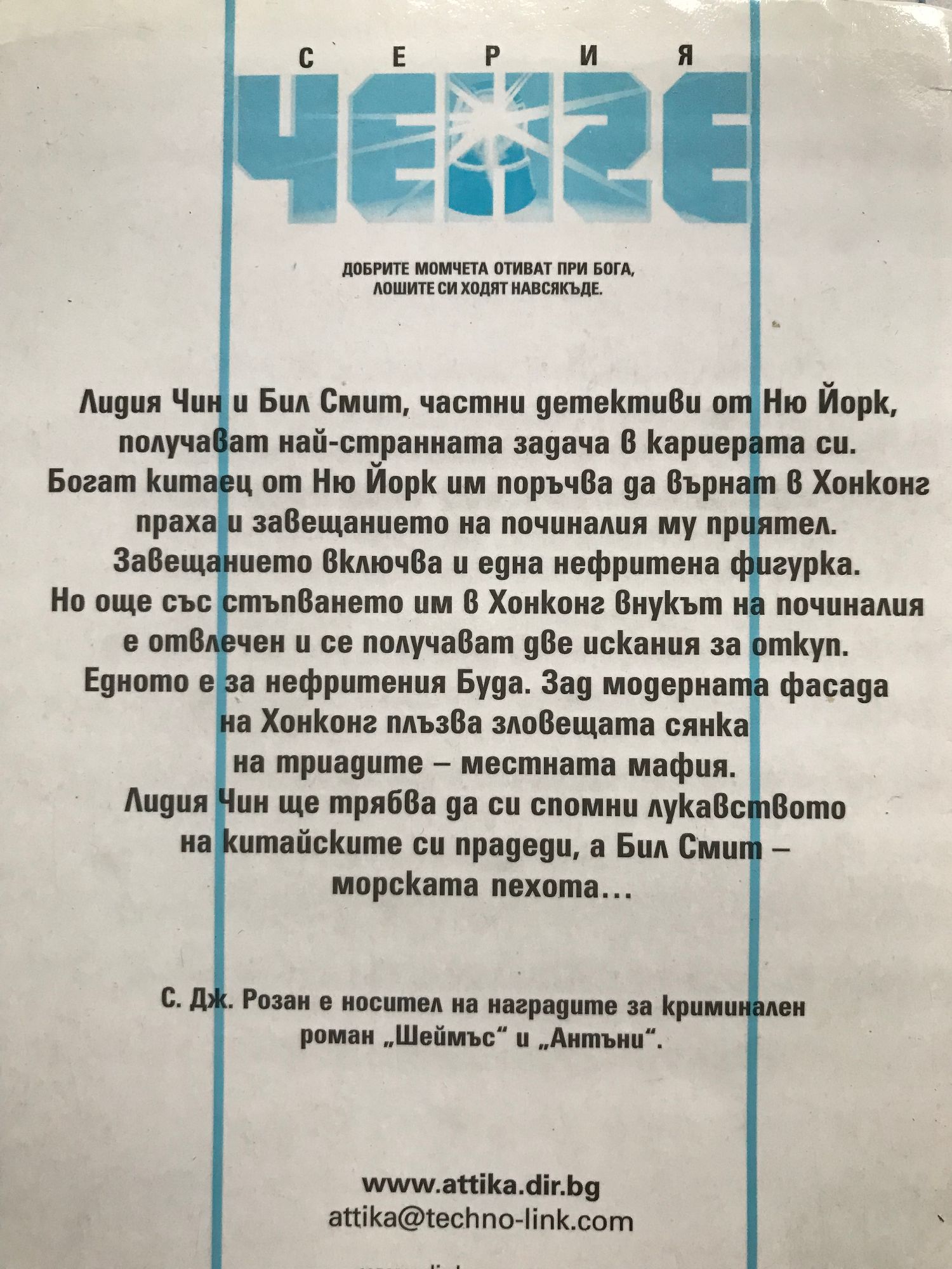 Лидия чин и бил Смит, частни детективи от Ню Йорк, получават най-странната задача в кариерата си. Богат китаец от Ню Йорк им поръчва да върнат в Хонконг праха и завещанието на починалия му приятел. Завещанието включва и една нефритена фигурка. Но още със стъпването им в Хонконг внукът на починалия е отвлечен и се получават две искания за откуп. Едното е за нефритения Буда. Зад модерната фасада на Хонконг плъзва зловещата сянка на триадите - местната мафия. Лидия Чин ще трябва да си спомни лукавството на китайските си прадеди, а Бил Смит - морската пехота….