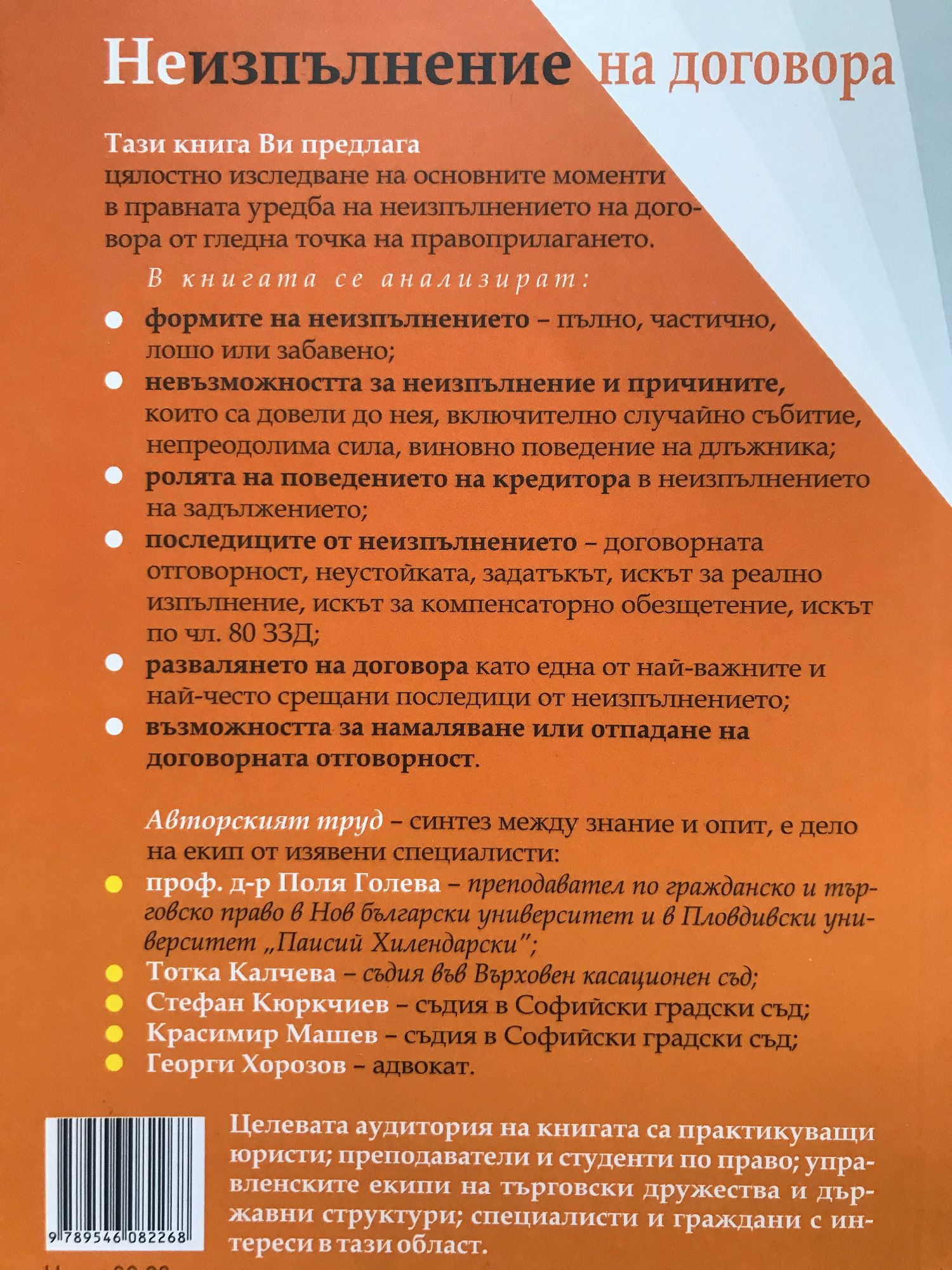 Това уникално издание Ви предлага: цялостно изследване на основните моменти в правната уредба на неизпълнението на договора от гледна точка на правоприлагането. В книгата се анализират: формите на неизпълнението - пълно, частично, лошо или забавено; невъзможността за неизпълнение и причините, които са довели до нея, включително случайно събитие, непреодолима сила, виновно поведение на длъжника; ролята на поведението на кредитора в неизпълнението на задължението; последиците от неизпълнението - договорната отговорност, неустойката, задатъкът, искът за реално изпълнение, искът за компенсаторно обезщетение, искът по чл. 80 ЗЗД; развалянето на договора като една от най-важните и най-често срещани последици от неизпълнението; възможността за намаляване или отпадане на договорната отговорност. Авторският труд - синтез между знание и опит, е дело на екип от изявени специалисти: проф. д-р Поля Голева - преподавател по гражданско и търговско право в Нов български университет и в Пловдивски университет „Паисий Хилендарски"; Тотка Калчева - съдия във Върховен касационен съд; Стефан Кюркчиев - съдия в Софийски градски съд; Красимир Машев - съдия в Софийски градски съд; Георги Хорозов - адвокат Целева аудитория: Практикуващи юристи, преподаватели и студенти по право, управленските екипи на търговски дружества и държавни структури, специалисти и граждани с интереси в тази област.