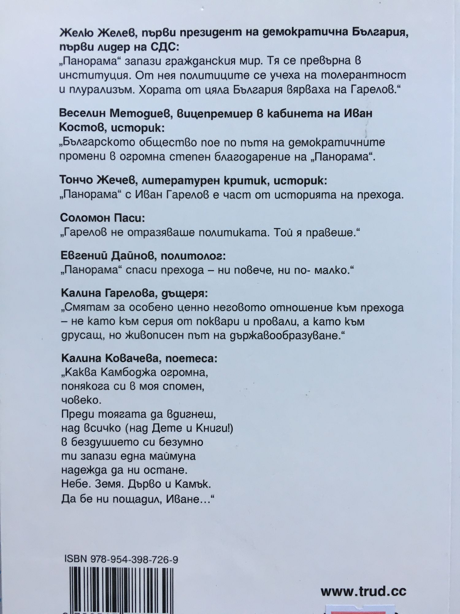 "Панорама" запази гражданския мир. Тя се превърна в институция. От нея политиците се учеха на толерантност и плурализъм. Хората от цяла България вярваха на Гарелов." Желю Желев, първи президент на демократична България, първи лидер на СДС "Българското общество пое по пътя на демократичните промени в огромна степен благодарение на "Панорама". Веселин Методиев, вицепремиер в кабинета на Иван Костов, историк "Панорама" с Иван Гарелов е част от историята на прехода." Тончо Жечев, литературен критик, историк "Гарелов не отразяваше политиката. Той я правеше." Соломон Паси "Панорама" спаси прехода - ни повече, ни по-малко." Евгений Дайнов, политолог "Смятам за особено ценно неговото отношение към прехода - не като към серия от поквари и провали, а като към друсащ, но живописен път на държавообразуване." Калина Гарелова "Каква Камбоджа огромна, понякога си в моя спомен, човеко. Преди тоягата да вдигнеш, над всичко (над Дете и Книги!) в бездушието си безумно ти запази една маймуна надежда да ни остане. Небе. Земя. Дърво и Камък. Да бе ни пощадил, Иване..."