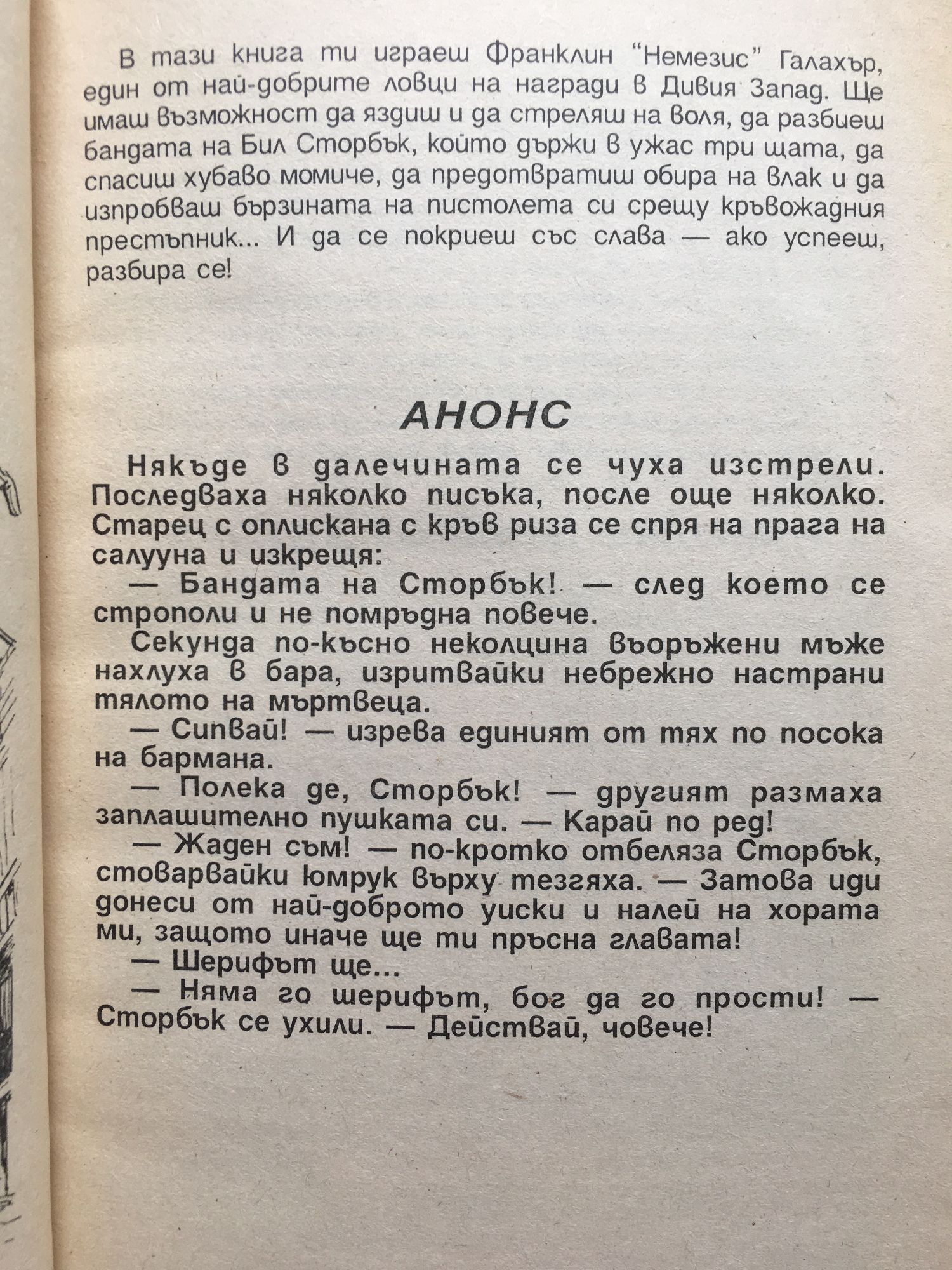 В тази книга ти играеш Франклин "Немезис" Галахър, един от най-добрите ловци на награди в Дивия Запад. Ще имаш възможност да яздиш и да стреляш на воля, да разбиеш бандата на Бил Сторбък, който държи в ужас три щата, да спасиш хубаво момиче, да предотвратиш обира на влак и да изпробваш бързината на пистолета си срещу кръвожадния престъпник... И да се покриеш със слава - ако успееш, разбира се!