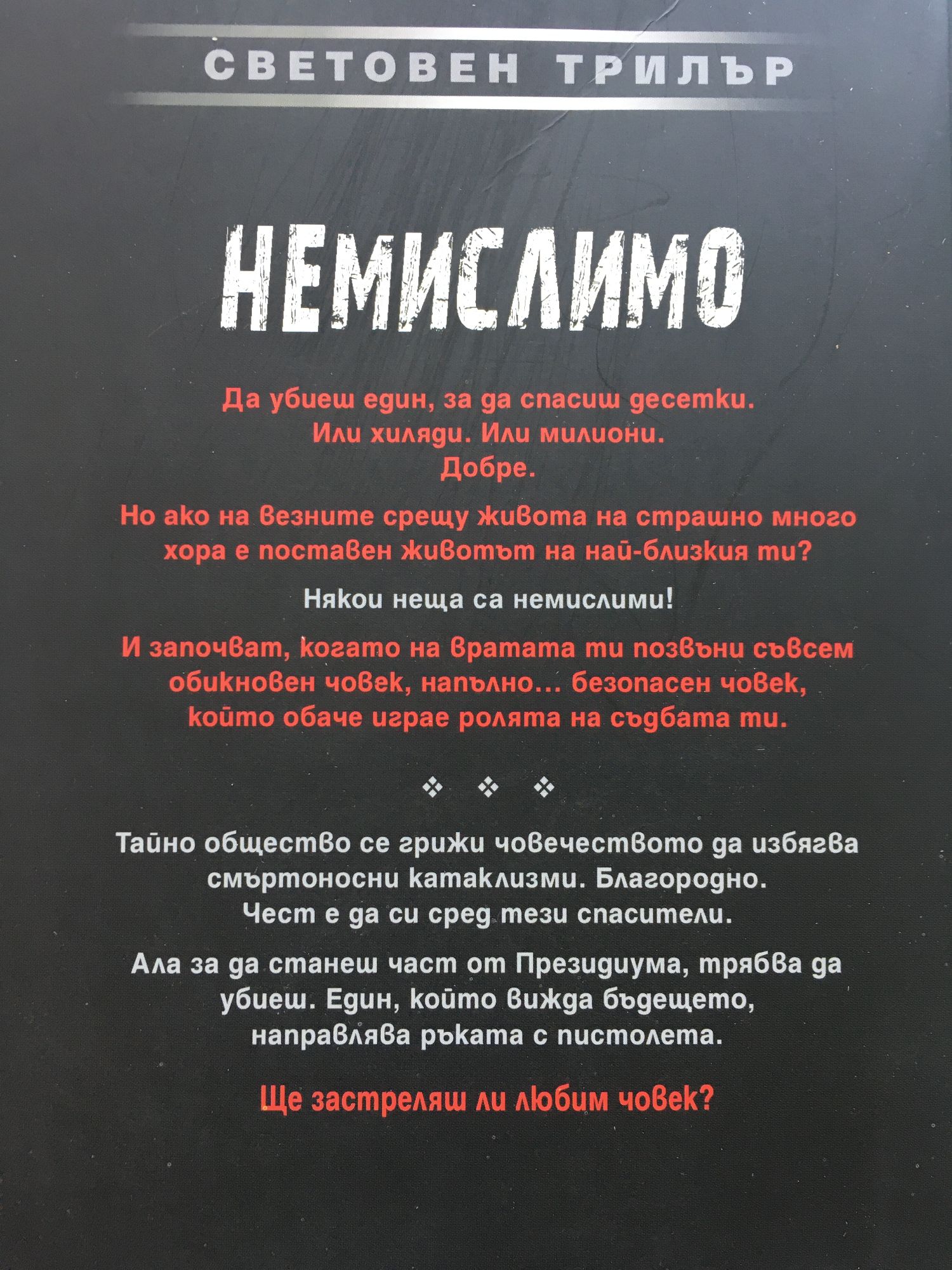 Ще ме убият! Само че не знам защо. Да убиеш един, за да спасиш десетки. Или хиляди. Или милиони. Добре. Но ако на везните срещу живота на страшно много хора е поставен животът на най-близкия ти? Някои неща са немислими! И започват, когато на вратата ти позвъни съвсем обикновен човек, напълно... безопасен човек, който обаче играе ролята на съдбата ти. * * * Тайно общество се грижи човечеството да избягва смъртоносни катаклизми. Благородно. Чест е да си сред тези спасители. Ала за да станеш част от Президиума, трябва да убиеш. Един, който вижда бъдещето, направлява ръката с пистолета. Ще застреляш ли любим човек?