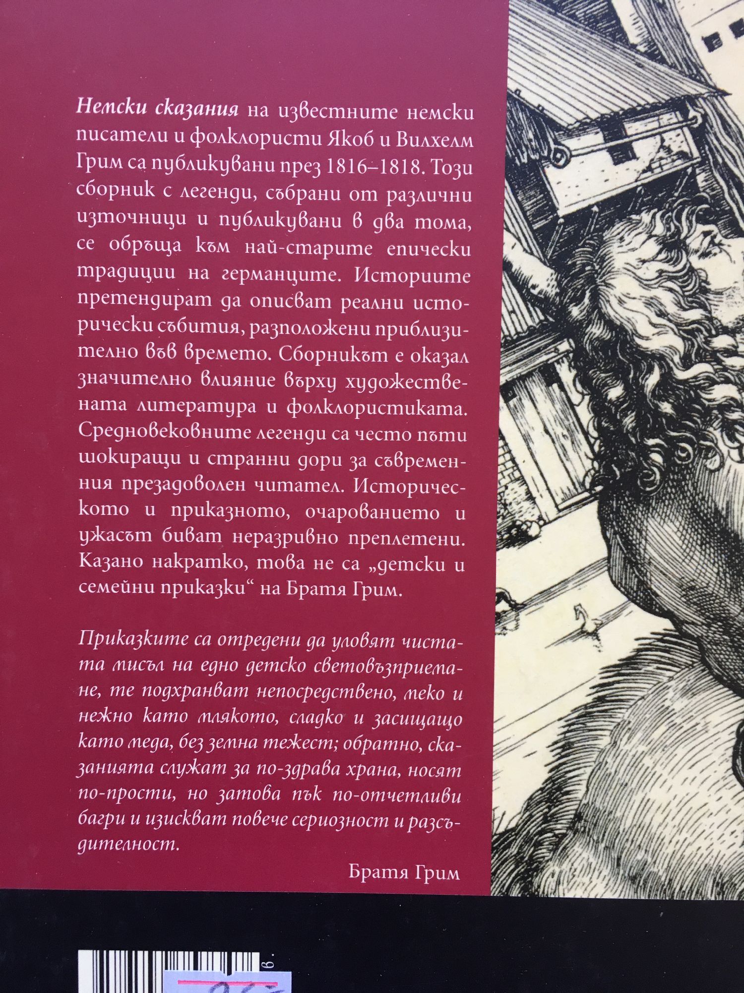 "Немски сказания" на известните писатели и фолклористи Якоб и Вилхелм Грим са публикувани през 1816-1818. Този сборник с легенди, събрани от различни източници и публикувани в два тома, се обобщава към най-старите епически традиции на германците. Историите претендират да описват реални исторически събития, разположени приблизително във времето. Сборникът е оказал значително влияние върху художествената литература и фолклористиката. Средновековните легенди са често пъти шокиращи и странни дори за съвременния презадоволен читател. Историческото и приказното, очарованието и ужасът биват неразривно преплетени. Казано накратко, това не са "детски и семейни приказки" на Братя Грим. Приказките са отредени да уловят чистата мисъл на едно детско световъзприемане, те подхранват непосредствено, меко и нежно като млякото, сладко и засищащо като меда, без земна тежест; обратно, сказанията служат за по-здрава храна, носят по-прости, но затова пък по-отчетливи багри и изискват повече сериозност и разсъдителност. Братя Грим