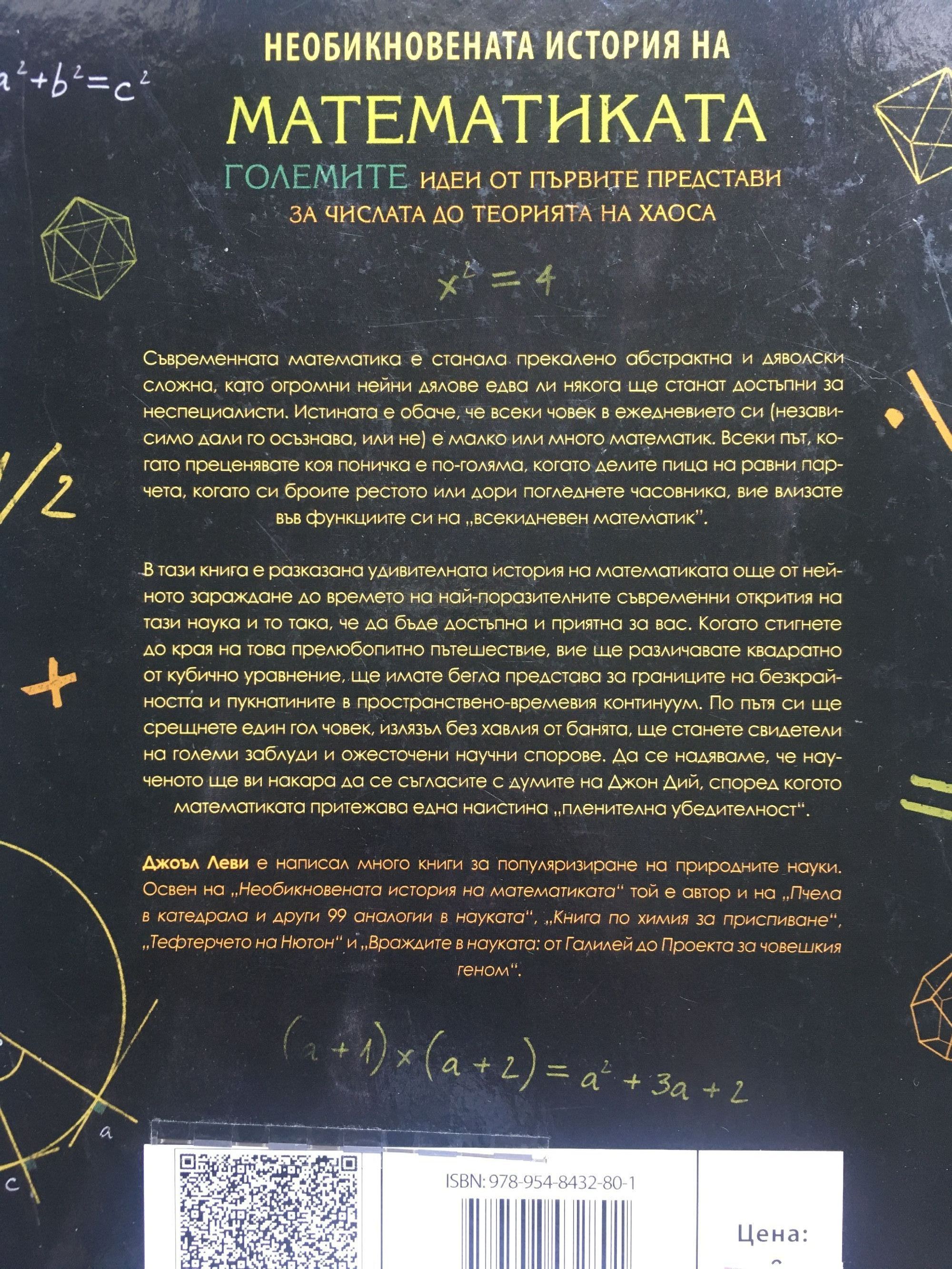 Съвременната математика е станала прекалено абстрактна и дяволски сложна, като огромни нейни дялове едва ли някога ще станат достъпни за неспециалисти. Истината е обаче, че всеки човек в ежедневието си (независимо дали го осъзнава, или не) е малко или много математик. Всеки път, когато преценявате коя поничка е по-голяма, когато делите пица на равни парчета, когато си броите рестото или дори погледнете часовника, вие влизате във функциите си на „всекидневен математик”. В тази книга е разказана удивителната история на математиката още от нейното зараждане до времето на най-поразителните съвременни открития на тази наука и то така, че да бъде достъпна и приятна за вас. Когато стигнете до края на това прелюбопитно пътешествие, вие ще различавате квадратно от кубично уравнение, ще имате бегла представа за границите на безкрайността и пукнатините в пространствено-времевия континуум. По пътя си ще срещнете един гол човек, излязъл без хавлия от банята, ще станете свидетели на големи заблуди и ожесточени научни спорове. Да се надяваме, че наученото ще ви накара да се съгласите с думите на Джон Дий, според когото математиката притежава една наистина „пленителна убедителност”. Джоъл Леви е написал много книги за популяризиране на природните науки. Освен на „Необикновената история на математиката“ той е автор и на „Пчела в катедрала и други 99 аналогии в науката“, „Книга по химия за приспиване“, „Тефтерчето на Нютон“ и „Враждите в науката: от Галилей до Проекта за човешкия геном“